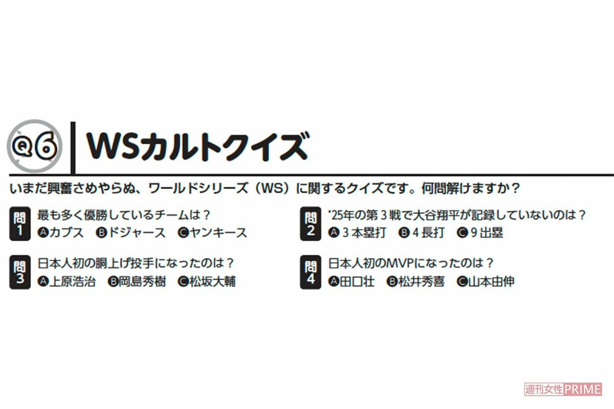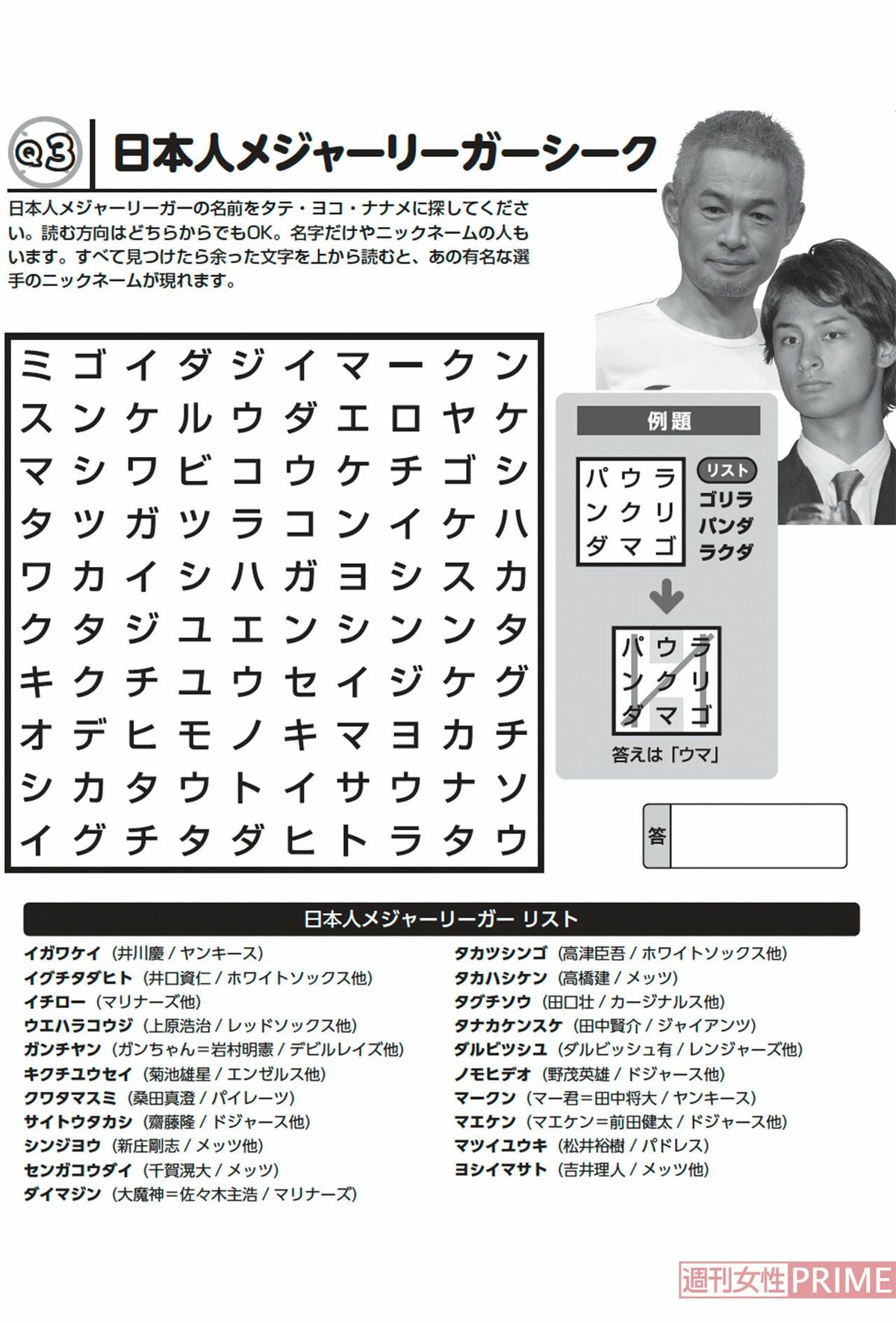 ライフ 2025/12/29 《脳トレ》大谷翔平・山本由伸・佐々木朗希、“ドジャース3人侍”の名シーンを振り返る!「脳が活性化する最高の暇つぶし」 大谷翔平山本由伸佐々木朗希ロサンゼルス・ドジャース野球MLB健康流行スポーツ 印刷 [写真 1/98枚目] ドジャースの大谷翔平、山本由伸、佐々木朗希 [写真 2/98枚目] 【Q1】優勝戦の三字熟語(ドジャース3人侍「脳トレパズル」) [写真 3/98枚目] 【Q2】3人侍のアロークロス(ドジャース3人侍「脳トレパズル」) [写真 4/98枚目] 【Q3】日本人メジャーリーガーシーク(ドジャース3人侍「脳トレパズル」) [写真 5/98枚目] 【Q4】スターを生んだ岩手スケルトン(ドジャース3人侍「脳トレパズル」) [写真 6/98枚目] 【Q5】祝・世界一!WS優勝まちがい探し(ドジャース3人侍「脳トレパズル」) [写真 7/98枚目] 【Q6】WSカルトクイズ(ドジャース3人侍「脳トレパズル」) [写真 8/98枚目] ドジャース3人侍「脳トレパズル」解答 [写真 9/98枚目] 大谷翔平公式Instagramより [写真 10/98枚目] 大谷翔平公式Instagramより [写真 11/98枚目] 大谷翔平公式Instagramより [写真 12/98枚目] 大谷翔平公式Instagramより [写真 13/98枚目] 大谷翔平 [写真 14/98枚目] 大谷翔平公式Instagramより [写真 15/98枚目] 大谷翔平 [写真 16/98枚目] 大谷翔平公式Instagramより [写真 17/98枚目] 大谷翔平公式Instagramより [写真 18/98枚目] 大谷翔平公式Instagramより [写真 19/98枚目] 大谷翔平 [写真 20/98枚目] 大谷翔平公式Instagramより [写真 21/98枚目] 大谷翔平 [写真 22/98枚目] ムーキー・ベッツ選手がクリスマスに撮影した家族との写真(ドジャース夫人会のインスタグラムより) [写真 23/98枚目] 2019年11月14日(日本時間)、MVPが発表された瞬間の大谷翔平と家族たち(ドジャースのインスタグラム) [写真 24/98枚目] 2019年2月19日、ロサンゼルス・エンゼルス時代にサンタの帽子を被った大谷翔平/産経ビジュアル [写真 25/98枚目] 11月22日に『SHOHEI OHTANI FAMILY FOUNDATION』(大谷翔平ファミリー財団)の設立を自身のインスタグラムで発表した [写真 26/98枚目] 《日本を代表して再びプレーできることを嬉しく思います》と記し、前回大会時の写真をアップして第6回WBC出場を表明した大谷翔平(本人のインスタグラムより) [写真 27/98枚目] 《日本を代表して再びプレーできることを嬉しく思います》と記し、前回大会時の写真をアップして第6回WBC出場を表明した大谷翔平(本人のインスタグラムより) [写真 28/98枚目] 《日本を代表して再びプレーできることを嬉しく思います》と記し、前回大会時の写真をアップして第6回WBC出場を表明した大谷翔平(本人のインスタグラムより) [写真 29/98枚目] 《日本を代表して再びプレーできることを嬉しく思います》と記し、前回大会時の写真をアップして第6回WBC出場を表明した大谷翔平(本人のインスタグラムより) [写真 30/98枚目] 2025年11月14日(日本時間)、MVPを受賞して真美子さんとデコピンと記念撮影に応じる大谷翔平(ドジャースのインスタグラムより) [写真 31/98枚目] 2025年11月2日(日本時間)、ワールドシリーズ2連覇を達成し、トロフィーを手にするドジャースの大谷翔平/共同通信 [写真 32/98枚目] 4度目のMVP受賞で真美子さん、デコピンらとの写真をアップした大谷翔平(本人のインスタグラムより) [写真 33/98枚目] 4度目のMVP受賞で真美子さん、デコピンらとの写真をアップした大谷翔平(本人のインスタグラムより) [写真 34/98枚目] 4度目のMVP受賞で真美子さん、デコピンらとの写真をアップした大谷翔平(本人のインスタグラムより) [写真 35/98枚目] 4度目となった大谷翔平のMVPインタビュー。ソファに座った大谷と真美子さんの間に、デコピンの姿も。夫妻がブラウンの服を着ていたことから「デコピンカラーのリンクコーデ」と話題に(『MLB Network』公式Xより) [写真 36/98枚目] 真美子さんのバッグにぶら下がっていたぬいぐるみは…(TikTokで話題になった動画より) [写真 37/98枚目] 大谷翔平夫妻がハマっている『リバーデイル』(公式サイトより) [写真 38/98枚目] 2025年11月4日、ドジャースの優勝パレードに参加した大谷翔平夫妻(共同通信社) [写真 39/98枚目] 「ママと結婚して」と書かれたカードを指差すようにして爆笑する大谷夫妻。真美子夫人が「見ないで」とばかりに大谷の顔を隠すシーンも(MLB公式Xより) [写真 40/98枚目] 「ママと結婚して」と書かれたカードを指差すようにして爆笑する大谷夫妻(MLB公式Xより) [写真 41/98枚目] 「ママと結婚して」と書かれたカードを指差すようにして爆笑する大谷夫妻(MLB公式Xより) [写真 42/98枚目] 大谷に対して「ママと結婚して」と書かれたカードを持った男性(MLB公式Xより) [写真 43/98枚目] ワールドシリーズ優勝記念パレードの様子をインスタグラムで公開した大谷翔平(公式インスタグラムより) [写真 44/98枚目] ワールドシリーズ優勝記念パレードの様子をインスタグラムで公開した大谷翔平(公式インスタグラムより) [写真 45/98枚目] 米大リーグ、ワールドシリーズ2連覇を達成したドジャースの優勝パレードに参加した大谷翔平と妻の真美子さん(写真 