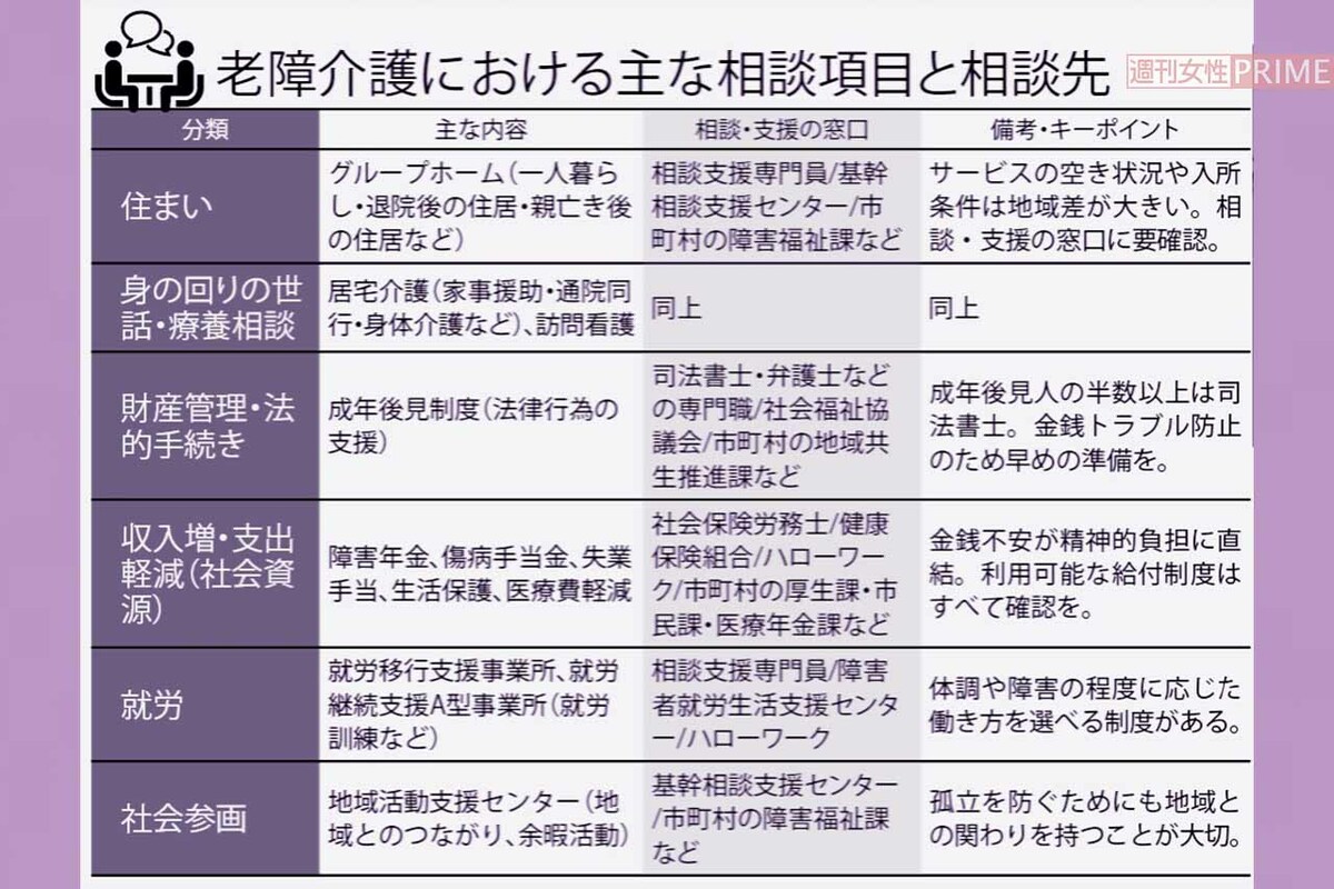 ライフ 2026/1/12 《高齢化社会で増加中》障害のある子を老親が介護する“老障介護”…迫りくる“親の死後”やお金の話などを専門家に聞いた 介護家族高齢化 印刷 [写真 1/11枚目] ※写真はイメージです [写真 2/11枚目] 太山敬さん [写真 3/11枚目] 老障介護における主な相談項目と相談先 [写真 4/11枚目] 写真はイメージです [写真 5/11枚目] 「ビジネス・ダブルケアラー」の成功例と失敗例 [写真 6/11枚目] 介護から「自分」を守る3つのポイント [写真 7/11枚目] 主な介護施設 [写真 8/11枚目] 上野利惠子著『介護されない未来を自分の手で作る』(青志社) [写真 9/11枚目] 介護でもらえる手当一覧 [写真 10/11枚目] 『介護のプロだけが知っている!介護でもらえる「お金」と「保障」がすらすらわかるノート』(実務教育出版) [写真 11/11枚目] 介護の準備は期限別に この写真の記事へ戻る