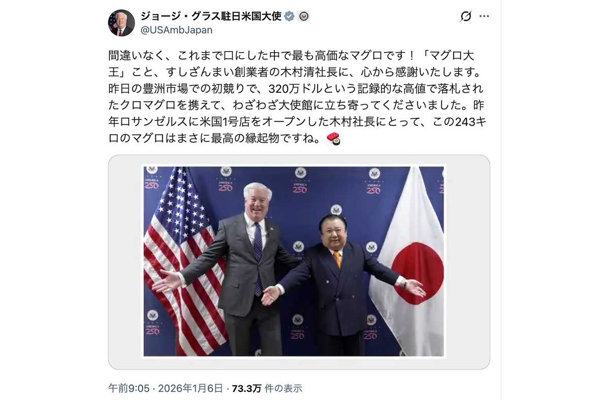 芸能 2026/1/7 『すしざんまい』木村清社長が米大使に“5億円マグロ”振る舞い「AI感」が話題、“元自衛官”の意外な経歴にも注目 文化人グルメ政治ビジネス 印刷 [写真 1/20枚目] 2026年1月5日、豊洲市場でのマグロの「初競り」で過去最高値となる5億1030万円で競り落とした『すしざんまい』木村清社長(公式Xより) [写真 2/20枚目] 「5億円マグロ」をアメリカのジョージ・グラス駐日大使に振る舞う『すしざんまい』木村清社長(グラス大使のXより) [写真 3/20枚目] へグセス米国戦争長官にスカジャンをプレゼントした小泉進次郎防衛大臣(ヘグセス氏のXより) [写真 4/20枚目] へグセス米国戦争長官にスカジャンをプレゼントした小泉進次郎防衛大臣(本人のXより) [写真 5/20枚目] トランプ大統領と握手を交わす高市首相(代表撮影) [写真 6/20枚目] トランプ大統領と高市首相(高市首相本人Xより) [写真 7/20枚目] 体を寄せトランプ大統領と仲睦まじい様子の高市首相(高市首相本人Xより) [写真 8/20枚目] SNSで拡散されている日米首脳会談時に乱れたNHK中継映像 [写真 9/20枚目] 高市早苗首相と握手を交わすトランプ大統領(首相官邸公式HPより) [写真 10/20枚目] 共同文書に署名する高市総理(右)とアメリカのトランプ大統領(2025年10月28日) [写真 11/20枚目] 「5億円マグロ」をアメリカのジョージ・グラス駐日大使に振る舞う『すしざんまい』木村清社長(グラス大使のXより) [写真 12/20枚目] 「5億円マグロ」をアメリカのジョージ・グラス駐日大使に振る舞う『すしざんまい』木村清社長(グラス大使のXより) [写真 13/20枚目] 2026年1月5日、豊洲市場でのマグロの「初競り」で過去最高値となる5億1030万円で競り落とした『すしざんまい』木村清社長(公式Xより) [写真 14/20枚目] 東京・渋谷駅に設置されたCUTIESTREETとすしざんまい社長を起用したLIFULLHOME’Sの巨大広告(撮影/編集部) [写真 15/20枚目] 東京・渋谷駅に設置されたCUTIESTREETとすしざんまい社長を起用したLIFULLHOME’Sの広告(撮影/編集部) [写真 16/20枚目] 東京・渋谷駅に設置されたCUTIESTREETとすしざんまい社長を起用したLIFULLHOME’Sの巨大広告(撮影/編集部) [写真 17/20枚目] 東京・渋谷駅に設置されたCUTIESTREETとすしざんまい社長を起用したLIFULLHOME’Sの広告(撮影/編集部) [写真 18/20枚目] 東京・渋谷駅に設置されたCUTIESTREETとすしざんまい社長を起用したLIFULLHOME’Sの広告前で記念撮影をする女性ファン(撮影/編集部) [写真 19/20枚目] 東京・渋谷駅に設置されたCUTIESTREETとすしざんまい社長を起用したLIFULLHOME’Sの広告(撮影/編集部) [写真 20/20枚目] 東京メトロに貼り出されたCUTIESTREETとすしざんまい社長を起用したLIFULLHOME’S広告のキャッチコピー(撮影/編集部) この写真の記事へ戻る