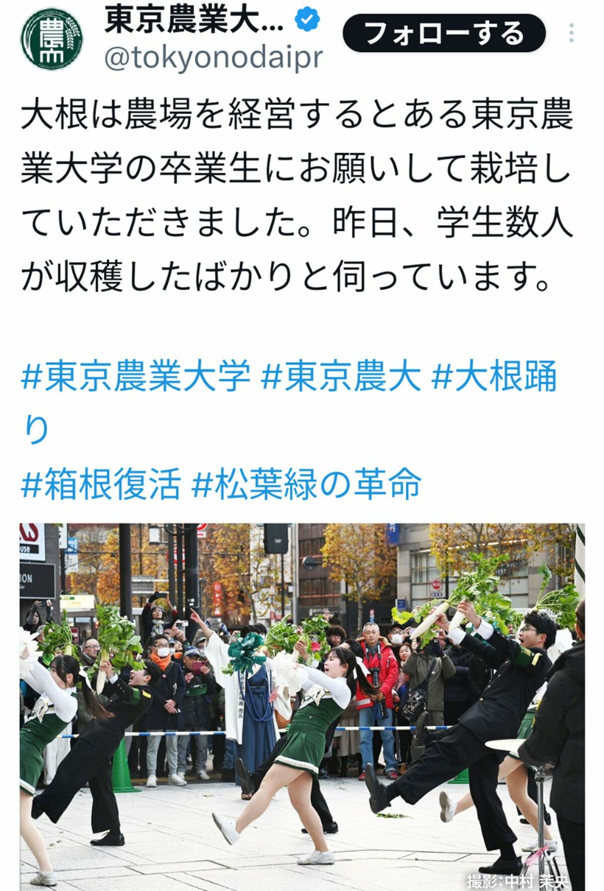 芸能 2026/1/7 箱根駅伝の東京農業大学、伝統の“大根踊り”をSNSで謝罪&削除要請「ローアングルからの撮影」という禁止事項に抵触か 箱根駅伝わいせつ盗撮日本テレビテレビ番組SNSスポーツ 印刷 [写真 1/17枚目] 大手町からスタートする箱根駅伝(写真は100回大会のもの、撮影/北村史成) [写真 2/17枚目] 東農大の“大根踊り”に関する投稿(大学の公式Xより) [写真 3/17枚目] 第93回箱根駅伝の予選会で敗退した中央大学 [写真 4/17枚目] 8区から9区の戸塚中継所の繰り上げスタート。襷をつながらなかった。 [写真 5/17枚目] 箱根駅伝(往路1〜5区、復路6〜10区) [写真 6/17枚目] 大迫傑さん(早大) [写真 7/17枚目] 関颯人選手など、期待の1年生を多く抱える東海大も注目 [写真 8/17枚目] 『ウルトラマンDASH』での青学駅伝チームを紹介する投稿(同番組の公式Xより) [写真 9/17枚目] 第102回箱根駅伝 出場校 [写真 10/17枚目] 悪性リンパ腫で死去した皆渡星七さんが綴っていた闘病SNS(noteより) [写真 11/17枚目] 箱根駅伝 撮影/北村史成 [写真 12/17枚目] 第99回箱根駅伝のスタート [写真 13/17枚目] 第99回箱根駅伝の総合優勝を果たした駒澤大学 [写真 14/17枚目] 鶴川正也選手(22)青山学院大・総合文化政策学部4年。出雲1区、全日本2区で区間賞と今季絶好調(写真/アフロ) [写真 15/17枚目] 吉田響選手(22)創価大・経済学部4年。3年のときに東海大から編入。3度目の5区山上りで区間新記録を狙う(写真/アフロ) [写真 16/17枚目] 篠原倖太朗選手(22)駒澤大・文学部4年。全日本7区では(平林清澄選手、太田蒼生選手との)エース対決を制し区間賞を獲得(写真/アフロ) [写真 17/17枚目] 平林清澄選手(22)國學院大・経済学部4年。 '24年の『大阪マラソン』で、初マラソンの日本選手最高記録を更新(写真/アフロ) この写真の記事へ戻る
