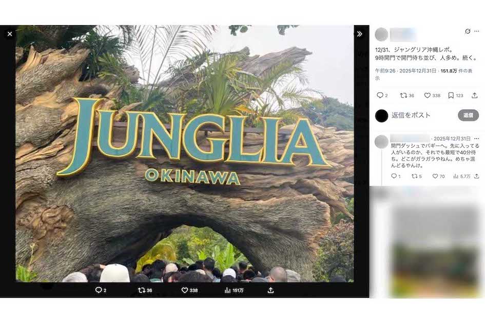 トレンド 2026/1/12 『ジャングリア沖縄』年末年始は「どこがガラガラやねん」ついに盛況か、悪天候日は苦戦でも進める“改革” 沖縄遊園地旅行流行 印刷 [写真 1/21枚目] 『ジャングリア沖縄』(公式サイトより) [写真 2/21枚目] 『ジャングリア沖縄』の実際の様子(Xより) [写真 3/21枚目] 『ジャングリア沖縄』のアトラクション(公式サイトより) [写真 4/21枚目] 『ジャングリア沖縄』のアトラクション(公式サイトより) [写真 5/21枚目] 『ジャングリア沖縄』のアトラクション(公式サイトより) [写真 6/21枚目] 『ジャングリア沖縄』のアトラクション(公式サイトより) [写真 7/21枚目] 『ジャングリア沖縄』のアトラクション(公式サイトより) [写真 8/21枚目] パノラマ ダイニングのイメージ図(ジャングリア沖縄公式サイトより) [写真 9/21枚目] ダイナソーサファリのイメージ図(ジャングリア沖縄公式サイトより) [写真 10/21枚目] 園内マップ(ジャングリア沖縄公式サイトより) [写真 11/21枚目] レストランメニュー(ジャングリア沖縄公式サイトより) [写真 12/21枚目] 世界一の贅沢インフィニティスパのイメージ図(ジャングリア沖縄公式サイトより) [写真 13/21枚目] 2025年の大晦日に『ジャングリア沖縄』を訪れた人は、混雑した様子を報告している(Xより) [写真 14/21枚目] ジャングリアの新アトラクション『やんばるトルネード』(公式サイト) [写真 15/21枚目] 『ジャングリア沖縄』のイメージ画像(公式サイトより) [写真 16/21枚目] 『ジャングリア沖縄』の実際の様子(Xより) [写真 17/21枚目] 『ジャングリア沖縄』の実際の様子(Xより) [写真 18/21枚目] 『ジャングリア沖縄』のイメージ画像(公式インスタグラムより) [写真 19/21枚目] 『ジャングリア沖縄』のアトラクション(公式サイトより) [写真 20/21枚目] 『ジャングリア沖縄』のアトラクション(公式サイトより) [写真 21/21枚目] 『ジャングリア沖縄』のアトラクション(公式サイトより) この写真の記事へ戻る