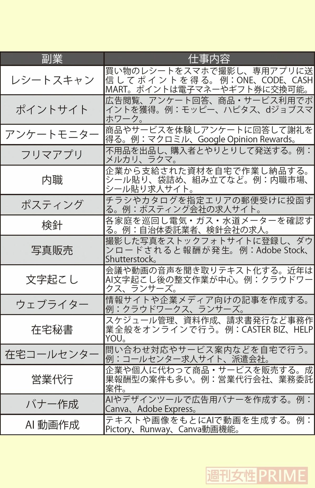 ライフ 2026/1/31 スマホひとつ、30分の『すき間副業』で月3万円!「短時間で会社員並み」プロが教える効率化のカギは“AI活用” マネー副業お金アルバイトスマホ派遣ポイ活家計 印刷 [写真 1/6枚目] ※写真はイメージです [写真 2/6枚目] 「内職は私も経験があり、段ボール1箱分シール貼りを行って1000円ほどもらえました。時給換算するとかなり安いですが」(野川さん)※写真はイメージです [写真 3/6枚目] フリマアプリでスニーカーや小物にペイントを施して売ったり、裁縫が得意な人は幼稚園で必要なレッスンバッグの制作代行をして販売する人も ※写真はイメージです [写真 4/6枚目] おすすめの「すき間副業」 [写真 5/6枚目] 野川ともみさん●2人目の出産を機に専業主婦となるが、在宅ワークという働き方を知り、オンライン秘書として復職。その後、在宅で起業し、現在はコンサルティングと広告代理店業である株式会社アトラクト、RIDE株式会社の2社を経営。女性コミュニティー「女性の生き方応援レシピ CheUP!」を主宰。 [写真 6/6枚目] ※写真はイメージです この写真の記事へ戻る