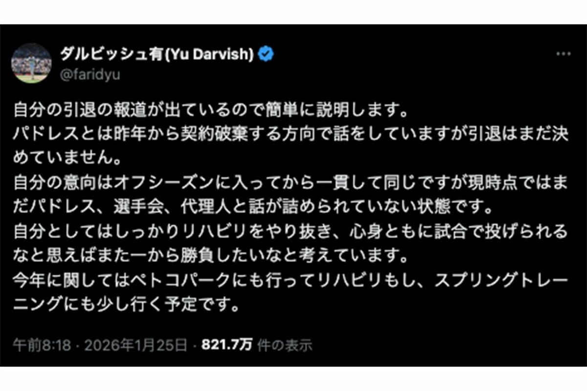芸能 2026/1/27 パドレスと契約破棄のダルビッシュ有、引退報道は否定で現実味帯びる日ハム復帰、オフに〈有原航平の背番号〉の伏線も ダルビッシュ有引退スポーツ野球大谷翔平MLBメジャーリーグロサンゼルス・ドジャースSNS 印刷 [写真 1/14枚目] WBC2023でも「11」を背負ったダルビッシュ有投手 [写真 2/14枚目] 引退報道を自身の公式Xで否定したダルビッシュ有 [写真 3/14枚目] 古閑美保とダルビッシュ有(2011年1月) [写真 4/14枚目] 2011年1月、宮崎市内で自主トレをする古閑美保とダルビッシュ有 [写真 5/14枚目] 2011年1月、宮崎市内で自主トレをする古閑美保とダルビッシュ有 [写真 6/14枚目] 2011年1月、宮崎市内で自主トレをする古閑美保とダルビッシュ有 [写真 7/14枚目] 2011年1月、宮崎市内で合同自主トレをする古閑美保とダルビッシュ有 [写真 8/14枚目] 2007年ダルビッシュ有と紗栄子は入籍した [写真 9/14枚目] ダルビッシュ有と紗栄子の長男でモデルの道休蓮(公式インスタグラムより) [写真 10/14枚目] ダルビッシュ有と紗栄子の長男でモデルの道休蓮(公式インスタグラムより) [写真 11/14枚目] ダルビッシュ有と紗栄子の長男でモデルの道休蓮(公式インスタグラムより) [写真 12/14枚目] モデルデビューを果たした道休蓮(『SPUR』のインスタグラムより) [写真 13/14枚目] モデルデビューを果たした道休蓮(本人インスタグラムより) [写真 14/14枚目] 宮崎県での合同自主トレで、ダルビッシュに寄り添う古閑美保(2011年) この写真の記事へ戻る