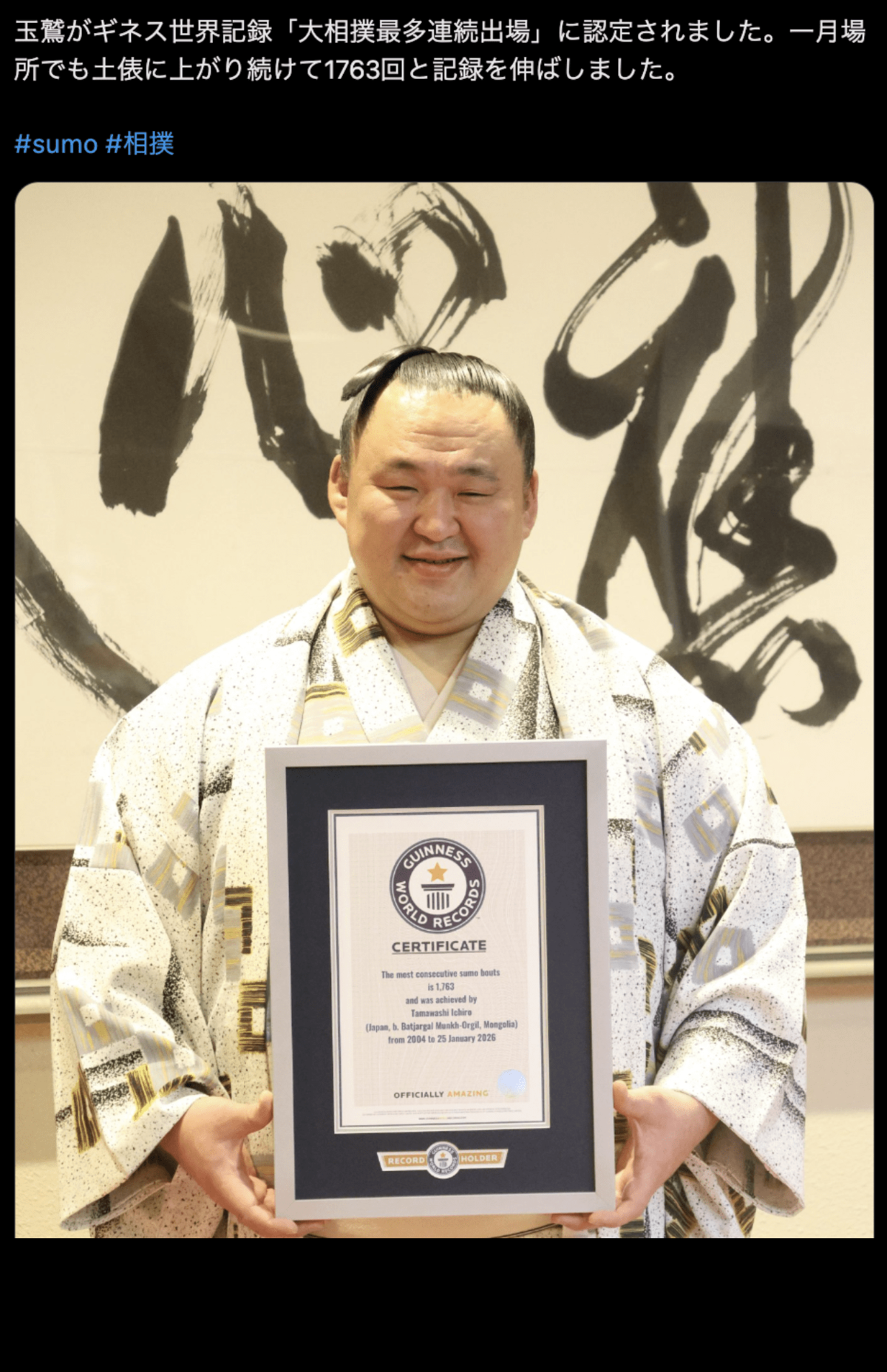 芸能 2026/1/28 《大相撲・ギネス世界記録》無休の鉄人・玉鷲が1763回連続出場の偉業「いつ土俵で死んでもいい」21年休場なしの“覚悟” 相撲スポーツ 印刷 [写真 1/15枚目] 大相撲の幕内力士・玉鷲一朗(片男波部屋公式HPより) [写真 2/15枚目] ギネス世界記録の公式認定証が贈呈されてご満悦の玉鷲(ギネス公式アカウントより) [写真 3/15枚目] ギネス世界記録の公式認定証が贈呈されてご満悦の玉鷲(ギネス公式アカウントより) [写真 4/15枚目] ギネス世界記録の公式認定証が贈呈されてご満悦の玉鷲(ギネス公式アカウントより) [写真 5/15枚目] ギネス世界記録の公式認定証が贈呈されてご満悦の玉鷲(ギネス公式アカウントより) [写真 6/15枚目] ギネス世界記録の公式認定証が贈呈されてご満悦の玉鷲(ギネス公式アカウントより) [写真 7/15枚目] 安青錦の師匠である安治川親方(元・安美錦)とおかみさん(在日ウクライナ大使館公式X より) [写真 8/15枚目] 1月18日、6年ぶりに相撲を観戦された愛子さま [写真 9/15枚目] 金星を獲得した熱海富士、懸賞金の束に驚く(Xより) [写真 10/15枚目] 金星獲得を師匠に報告した熱海富士(伊勢ヶ濱部屋後援会公式Xより) [写真 11/15枚目] 金星を獲得した熱海富士のニコニコショット(Xより) [写真 12/15枚目] 安青錦が来店した時の写真を投稿して優勝を祝うカフェ『クラヤヌィ』の公式X [写真 13/15枚目] 初土俵から14場所となった11月の九州場所で内閣総理大臣杯を受ける安青錦/共同通信 [写真 14/15枚目] ウクライナ出身の安青錦(写真/産経) [写真 15/15枚目] 2026年1月、天覧相撲では淡い桜色の振り袖を この写真の記事へ戻る