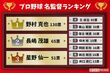 芸能 2026/2/6 《プロ野球“名監督”ランキング》球界のレジェンドや弱小チームを救った名将の中で圧倒的1位に輝いたのは スポーツ野球ランキング 印刷 [写真 1/39枚目] 左から野村克也さん、長嶋茂雄さん、王貞治 [写真 2/39枚目] 2023年3月の『WBC』で解説を務めた王貞治氏 [写真 3/39枚目] プロ野球「名監督」ランキング ※インターネットアンケートサイト「Freeasy」にて1月下旬、全国の25歳以上60歳以下の男女500人を対象に実施 [写真 4/39枚目] 1982年のアニメ『二死満塁』に本人役で特別出演。声優の田中真弓からアドバイスを受ける長嶋茂雄さん [写真 5/39枚目] 1982年のアニメ『二死満塁』に、本人役で特別出演した長嶋茂雄さん [写真 6/39枚目] 長嶋茂雄さん(2013年5月9日) [写真 7/39枚目] 2013年5月31日の千葉県民栄誉賞の授賞式でも、国民栄誉賞受賞時と同じ濃紺スーツを着用した長嶋茂雄さん [写真 8/39枚目] 2013年5月9日、旧読売巨人軍多摩川グラウンドに帰ってきた長嶋茂雄さん [写真 9/39枚目] 大谷翔平が長嶋茂雄さんとのツーショットを投稿。2025年6月3日、長嶋さん死去の知らせを受けて(公式インスタグラムより) [写真 10/39枚目] 長嶋茂雄さんとのツーショットを投稿した大谷翔平、2025年3月「MLB東京シリーズ」にて(本人のインスタグラムより) [写真 11/39枚目] 長嶋茂雄さんとのツーショットを投稿した大谷翔平、2025年3月「MLB東京シリーズ」にて(本人のインスタグラムより) [写真 12/39枚目] 星野仙一 [写真 13/39枚目] 星野仙一 [写真 14/39枚目] 星野仙一記念館 [写真 15/39枚目] 王貞治会長(2013年) [写真 16/39枚目] ソフトバンクホークス・王貞治会長 [写真 17/39枚目] 王貞治 [写真 18/39枚目] 新庄剛志と王貞治氏(2010年、映画『僕たちのプレイボール』イベントにて) [写真 19/39枚目] 目黒の自宅前で週刊女性の取材に答える王さん(13年) [写真 20/39枚目] 髭を伸ばしている落合博満氏。現役や監督時代のイメージとギャップがある(落合博満野球記念館公式Xより) [写真 21/39枚目] 2週間に1回ほど、髭のメンテナンスをしている落合氏(落合氏の公式YouTubeチャンネル『落合博満のオレ流チャンネル』のXより) [写真 22/39枚目] 落合博満氏 [写真 23/39枚目] 元同僚の斎藤佑樹氏、恩師の栗山英樹氏と記念写真をとる杉谷拳士(公式インスタグラムより) [写真 24/39枚目] WBC優勝後に栗山英樹監督との再会を報告した斎藤佑樹氏(公式インスタグラムより) [写真 25/39枚目] 栗山英樹監督 [写真 26/39枚目] 侍ジャパンの白井一幸ヘッドコーチ(左)と栗山英樹監督(右) [写真 27/39枚目] 栗山英樹監督(右)の招集に応じて侍ジャパン入りした大谷翔平 [写真 28/39枚目] WBCの日本代表に就任した栗山英樹監督と握手する大谷翔平 [写真 29/39枚目] WBCの日本代表に就任した栗山英樹監督と会見に臨む大谷翔平 [写真 30/39枚目] 栗山英樹監督とダルビッシュ有(公式ツイッターより) [写真 31/39枚目] 2005年8月、『高須クリニック』の美容イベントに出席した野村克也さん、沙知代さん夫妻 [写真 32/39枚目] 2005年8月、『高須クリニック』の美容イベントに出席した野村克也さん、沙知代さん夫妻 [写真 33/39枚目] 2005年8月、『高須クリニック』の美容イベントに出席した野村克也さん、沙知代さん夫妻 [写真 34/39枚目] 『鮨太鼓』には、野村克也さんのユニフォームや直筆サイン、生前の写真などが飾られている [写真 35/39枚目] '57年、21歳の野村克也さん。この年、南海捕手として本塁打王に輝く [写真 36/39枚目] 婚約発表時の長嶋茂雄さんと妻・亜希子さん。長嶋さんが口説き落として交際から約40日で婚約 [写真 37/39枚目] ビートたけしと長嶋茂雄 [写真 38/39枚目] 長嶋茂雄人形 [写真 39/39枚目] 左から張本勲、大鵬、長嶋茂雄、力道山。当時のスーパースターたちだ この写真の記事へ戻る
