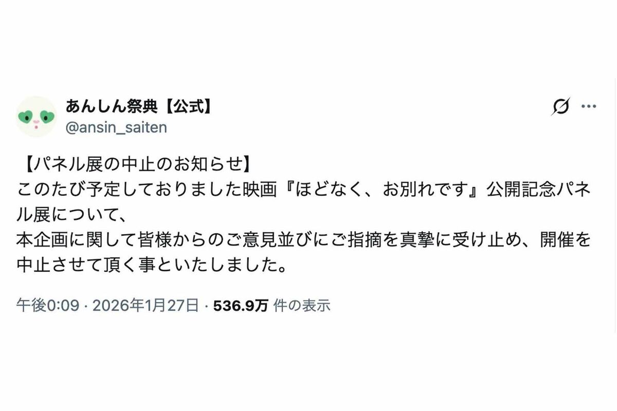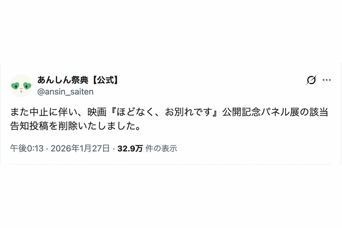 旧ジャニーズ 2026/1/30 目黒蓮・浜辺美波の主演映画『ほどなく、お別れです』、葬儀会社が“パネル展”告知も大炎上でイベント中止 目黒蓮浜辺美波Snow Man映画葬儀イベント炎上 印刷 [写真 1/37枚目] 映画『ほどなく、お別れです』W主演の目黒蓮と浜辺美波 [写真 2/37枚目] 『あんしん祭典』による映画『ほどなく、お別れです』のパネル展告知(公式Xより) [写真 3/37枚目] 目黒蓮が主演を務める映画『SAKAMOTO DAYS』ポスター [写真 4/37枚目] 目黒蓮が主演を務める映画『SAKAMOTO DAYS』ポスター [写真 5/37枚目] 目黒蓮が実写版映画の主人公に?累計発行部数1500万部超の人気漫画『SAKAMOTO DAYS』(週刊少年ジャンプ公式サイトより) [写真 6/37枚目] CMのオフショットを公開した目黒蓮(本人インスタグラムより) [写真 7/37枚目] 劇場版『トリリオンゲーム』のロケで、目黒蓮らを乗せたフェリー『金風呂丸』(公式HPより) [写真 8/37枚目] 左から目黒蓮、原嘉孝、寺西拓人、森継亮太。“国民の元カレ”こと寺西も、当時はギャル男風の雰囲気(2017年10月) [写真 9/37枚目] 左からtimeleszの原嘉孝、寺西拓人、元Jr.の森継亮太、茶髪でキャップをかぶり、今とはまるで別人のSnow Manの目黒蓮(2017年10月) [写真 10/37枚目] 左から寺西拓人、目黒蓮、原嘉孝、森継亮太。ハシャぎながら、寺西がめいっぱい手を伸ばして自撮りでパチリ(2017年10月) [写真 11/37枚目] 後列左から元Jr.の田中誠治、原嘉孝、目黒蓮、寺西拓人。前列左からKEY TO LITの井上瑞稀、森継亮太、田中斗希、金田耀生(2014年5月) [写真 12/37枚目] 2月16日に28歳の誕生日を迎えた目黒蓮(目黒蓮公式Instagramより) [写真 13/37枚目] 『日曜日の初耳学』2023年3月の放送にも出演していた目黒蓮(番組公式Instagramより) [写真 14/37枚目] 『日曜日の初耳学』2024年4月の放送で“林修と目黒蓮が似ている問題”について語った川口春奈(番組公式Instagramより) [写真 15/37枚目] timeleszの新メンバーで目黒蓮の親友・原嘉孝も登場した『日曜日の初耳学』(番組公式YouTubeより) [写真 16/37枚目] timeleszの新メンバーで目黒蓮の親友・原嘉孝も登場した『日曜日の初耳学』(番組公式YouTubeより) [写真 17/37枚目] 『日曜日の初耳学』2月16日の放送で“林修と目黒蓮が似ている問題”を再び取り上げた(番組公式Instagramより) [写真 18/37枚目] 『日曜日の初耳学』に出演した林修と目黒蓮(番組公式Instagramより) [写真 19/37枚目] 原嘉孝(左)と目黒蓮(原嘉孝の公式インスタグラムより) [写真 20/37枚目] 『FENDI』で日本人初となるグローバル広告キャンペーンのモデルに起用されたSnow Manの目黒蓮(ブランドの公式ホームページより) [写真 21/37枚目] 『FENDI』で日本人初となるグローバル広告キャンペーンのモデルに起用されたSnow Manの目黒蓮(ブランドの公式ホームページより) [写真 22/37枚目] 『FENDI』で日本人初となるグローバル広告キャンペーンのモデルに起用されたSnow Manの目黒蓮(ブランドの公式ホームページより) [写真 23/37枚目] 『FENDI』で日本人初となるグローバル広告キャンペーンのモデルに起用されたSnow Manの目黒蓮(本人インスタグラムより) [写真 24/37枚目] 目黒蓮の1000円札が拡散された投稿(TikTokより) [写真 25/37枚目] 目黒蓮の1000円札が拡散された投稿(TikTokより) [写真 26/37枚目] 目黒蓮の1000円札が拡散された投稿(TikTokより) [写真 27/37枚目] 『第41回ベストジーニスト2024』の「一般選出部門」を受賞したSnow Manの目黒蓮 [写真 28/37枚目] 『第41回ベストジーニスト2024』の「一般選出部門」を受賞したSnow Manの目黒蓮 [写真 29/37枚目] 批判の声を受け、映画『ほどなく、お別れです』のパネル展を中止した『あんしん祭典』(公式Xより) [写真 30/37枚目] 批判の声を受け、映画『ほどなく、お別れです』のパネル展を中止した『あんしん祭典』(公式Xより) [写真 31/37枚目] 映画『ほどなく、お別れです』(公式サイトより) [写真 32/37枚目] 映画『ほどなく、お別れです』のパネル展告知で大炎上した葬儀会社『あんしん祭典』 [写真 33/37枚目] 映画『ほどなく、お別れです』のパネル展告知で大炎上した葬儀会社『あんしん祭典』 [写真 34/37枚目] 映画『ほどなく、お別れです』のパネル展告知で大炎上した葬儀会社『あんしん祭典』 [写真 35/37枚目] 2025年10月下旬、日曜劇場『ザ・ロイヤルファミリー』ロケに参加した目黒蓮 [写真 36/37枚目] 2025年10月下旬、休憩中もスタッフと笑顔で言葉を交わしていた目黒蓮。そんな彼の姿に、現場も和んでいた [写真 37/37枚目] 目黒蓮の等身大パネルは特に高値で取引きされている この写真の記事へ戻る