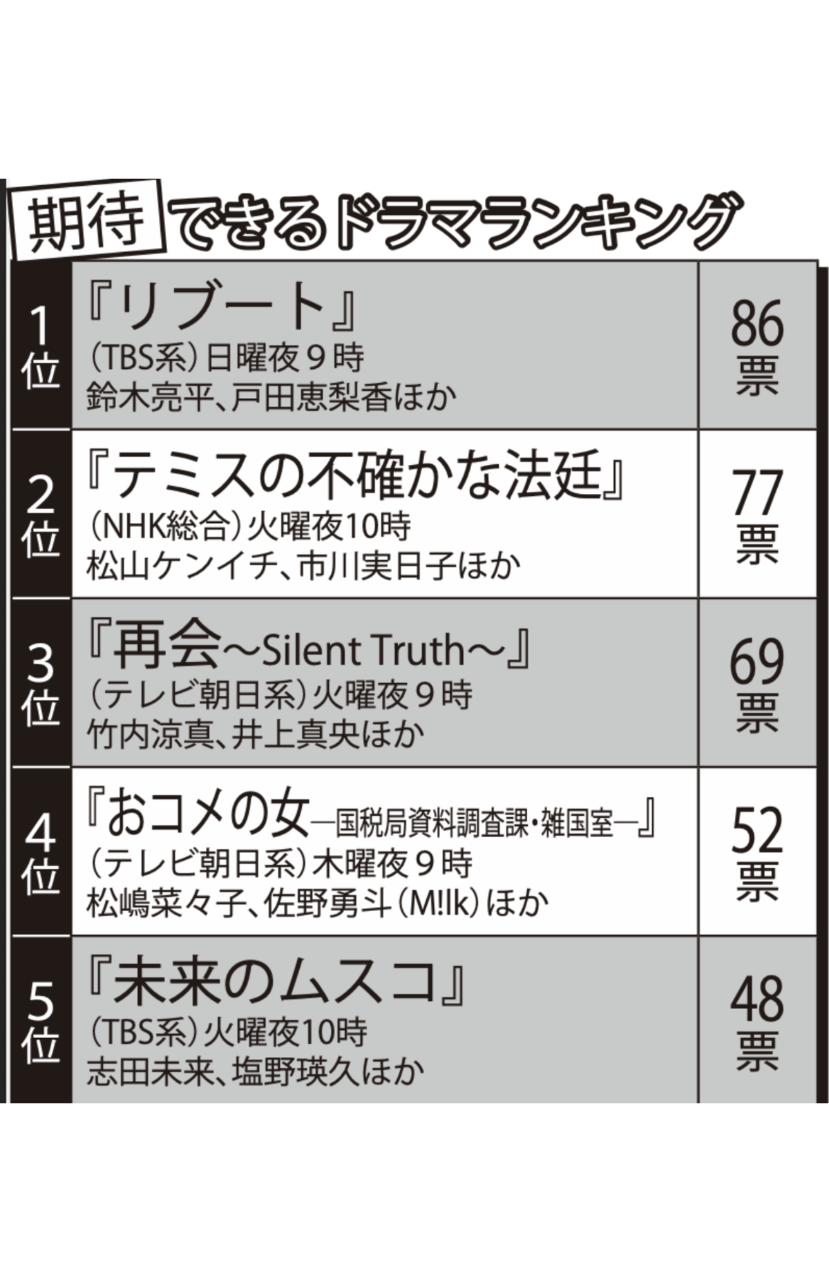 芸能 2026/2/9 《2026「期待できる」冬ドラマランキングTOP5》松嶋菜々子や竹内涼真らを抑えたのは、鈴木亮平主演の日曜劇場『リブート』 鈴木亮平松山ケンイチ松嶋菜々子志田未来ドラマテレビ番組ランキング女優男優 印刷 [写真 1/14枚目] 「期待できる」冬ドラマランキングTOP5 [写真 2/14枚目] “素の姿”を披露した志田未来(公式インスタグラムより) [写真 3/14枚目] 木曜ドラマ『おコメの女-国税局資料調査課・雑国室-』テレビ朝日系 木曜夜9時〜 [写真 4/14枚目] 竹内涼真 [写真 5/14枚目] ドラマ10『テミスの不確かな法廷』 NHK総合毎週火曜夜10時〜 ※NHKONE(新NHKプラス)で同時・見逃し配信中 [写真 6/14枚目] 「期待できる」冬ドラマランキングTOP5 [写真 7/14枚目] ドラマ『リブート』(TBS系)ロケ地となったシャトー洋菓子店にはドラマのポスターも 撮影/編集部 [写真 8/14枚目] ドラマ『リブート』(TBS系)の「ハヤセ洋菓子店」ロケ地となったシャトー洋菓子店の店内 撮影/編集部 [写真 9/14枚目] ドラマ『リブート』(TBS系)のロケ地となった武蔵すずらん通り商店街 撮影/編集部 [写真 10/14枚目] ドラマ『リブート』(TBS系)のロケ地となった武蔵すずらん通り商店街 撮影/編集部 [写真 11/14枚目] ドラマ『リブート』(TBS系)の「ハヤセ洋菓子店」ロケ地となったシャトー洋菓子店 撮影/編集部 [写真 12/14枚目] ドラマ『リブート』(TBS系)の「ハヤセ洋菓子店」ロケ地となったシャトー洋菓子店 撮影/編集部 [写真 13/14枚目] 『映画芸術』公式Xで発表された2025年ベスト作品ランキング [写真 14/14枚目] 『映画芸術』公式Xで発表された2025年ワースト作品ランキング この写真の記事へ戻る
