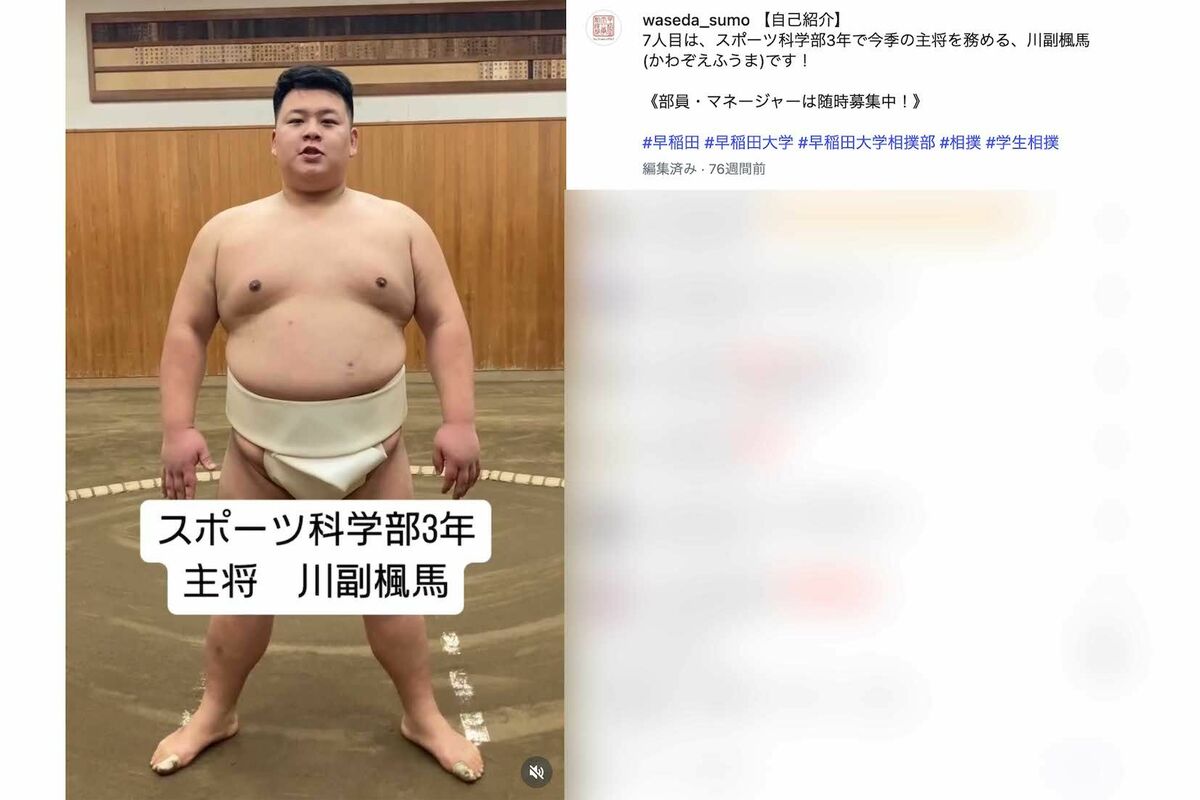 芸能 2026/2/5 《大相撲》安青錦と同級生の早大相撲部主将・川副楓馬が“81年ぶり”安治川部屋に入門、夢は「ハリウッドスター」お茶目な“素顔” 安青錦相撲スポーツ大学 印刷 [写真 1/41枚目] 安治川部屋に入門する早稲田大学相撲部の主将・川副楓馬(早大相撲部のインスタグラムより) [写真 2/41枚目] 安治川部屋に入門する早稲田大学相撲部の主将・川副楓馬(早大相撲部のインスタグラムより) [写真 3/41枚目] 2013年、成田山節分会に参加した力士たち(写真/廣瀬靖士) [写真 4/41枚目] 2013年、成田山節分会に参加した力士たち(写真/廣瀬靖士) [写真 5/41枚目] 2013年、成田山節分会に参加した力士たち(写真/廣瀬靖士) [写真 6/41枚目] 大相撲の幕内力士・玉鷲一朗(片男波部屋公式HPより) [写真 7/41枚目] 大相撲の幕内力士・玉鷲一朗(41)※日本相撲協会公式サイトより [写真 8/41枚目] ギネス世界記録の公式認定証が贈呈されてご満悦の玉鷲(ギネス公式アカウントより) [写真 9/41枚目] ギネス世界記録の公式認定証が贈呈されてご満悦の玉鷲(ギネス公式アカウントより) [写真 10/41枚目] ギネス世界記録の公式認定証が贈呈されてご満悦の玉鷲(ギネス公式アカウントより) [写真 11/41枚目] ギネス世界記録の公式認定証が贈呈されてご満悦の玉鷲(ギネス公式アカウントより) [写真 12/41枚目] ギネス世界記録の公式認定証が贈呈されてご満悦の玉鷲(ギネス公式アカウントより) [写真 13/41枚目] 金星を獲得した熱海富士、懸賞金の束に驚く(Xより) [写真 14/41枚目] 金星獲得を師匠に報告した熱海富士(伊勢ヶ濱部屋後援会公式Xより) [写真 15/41枚目] 金星を獲得した熱海富士のニコニコショット(Xより) [写真 16/41枚目] 琴ノ若(現・佐渡ケ嶽親方) [写真 17/41枚目] 第52代横綱・北の富士 [写真 18/41枚目] 若嶋津と高田みづえの結婚式 [写真 19/41枚目] 第48代横綱・大鵬 [写真 20/41枚目] 第58代横綱・千代の富士 [写真 21/41枚目] 第65代横綱・貴乃花 [写真 22/41枚目] 衝撃的だった外国人力士ランキング(週刊女性PRIME調べ) [写真 23/41枚目] ハワイ出身の元祖外国人力士・高見山 [写真 24/41枚目] 引退後はタレントとして活動しお茶の間の人気者になった小錦 [写真 25/41枚目] 2004年にフラダンサーで歌手の飯島千絵さんと結婚した小錦 [写真 26/41枚目] 義ノ富士(日本相撲協会ホームページより) [写真 27/41枚目] 『相撲競技観戦契約約款』が定めている禁止行為(日本相撲協会ホームページより) [写真 28/41枚目] 漫画家・高橋陽一氏が描いた『キャプテン翼』の化粧まわしをする大島部屋の旭海雄 [写真 29/41枚目] 漫画家・高橋陽一氏が描いた『キャプテン翼』の化粧まわしをする大島部屋の旭海雄 [写真 30/41枚目] 全国の15歳以上99歳以下の男女500人を対象に実施した「昭和・平成・令和のおすもうさん」ランキング(2025年12月) [写真 31/41枚目] 平成12年に大関に昇進した雅山(現・二子山親方) [写真 32/41枚目] 平成12年に大関に昇進した雅山(現・二子山親方) [写真 33/41枚目] 安治川部屋に入門する早稲田大学相撲部の主将・川副楓馬(早大相撲部のインスタグラムより) [写真 34/41枚目] 安治川部屋に入門する早稲田大学相撲部の主将・川副楓馬(早大相撲部のインスタグラムより) [写真 35/41枚目] 安治川部屋に入門する早稲田大学相撲部の主将・川副楓馬(早大相撲部のインスタグラムより) [写真 36/41枚目] 安治川部屋に入門する早稲田大学相撲部の主将・川副楓馬(早大相撲部のインスタグラムより) [写真 37/41枚目] 安治川部屋に入門する早稲田大学相撲部の主将・川副楓馬(早大相撲部のインスタグラムより) [写真 38/41枚目] 安治川部屋に入門する早稲田大学相撲部の主将・川副楓馬(早大相撲部のインスタグラムより) [写真 39/41枚目] 安青錦の師匠である安治川親方(元・安美錦)とおかみさん(在日ウクライナ大使館公式Xより) [写真 40/41枚目] 安青錦が来店した時の写真を投稿して優勝を祝うカフェ『クラヤヌィ』の公式X [写真 41/41枚目] 2026年大相撲初場所で2連覇をした安青錦に宮崎県知事賞の牛一頭を贈った河野俊嗣知事(本人のインスタグラムより) この写真の記事へ戻る