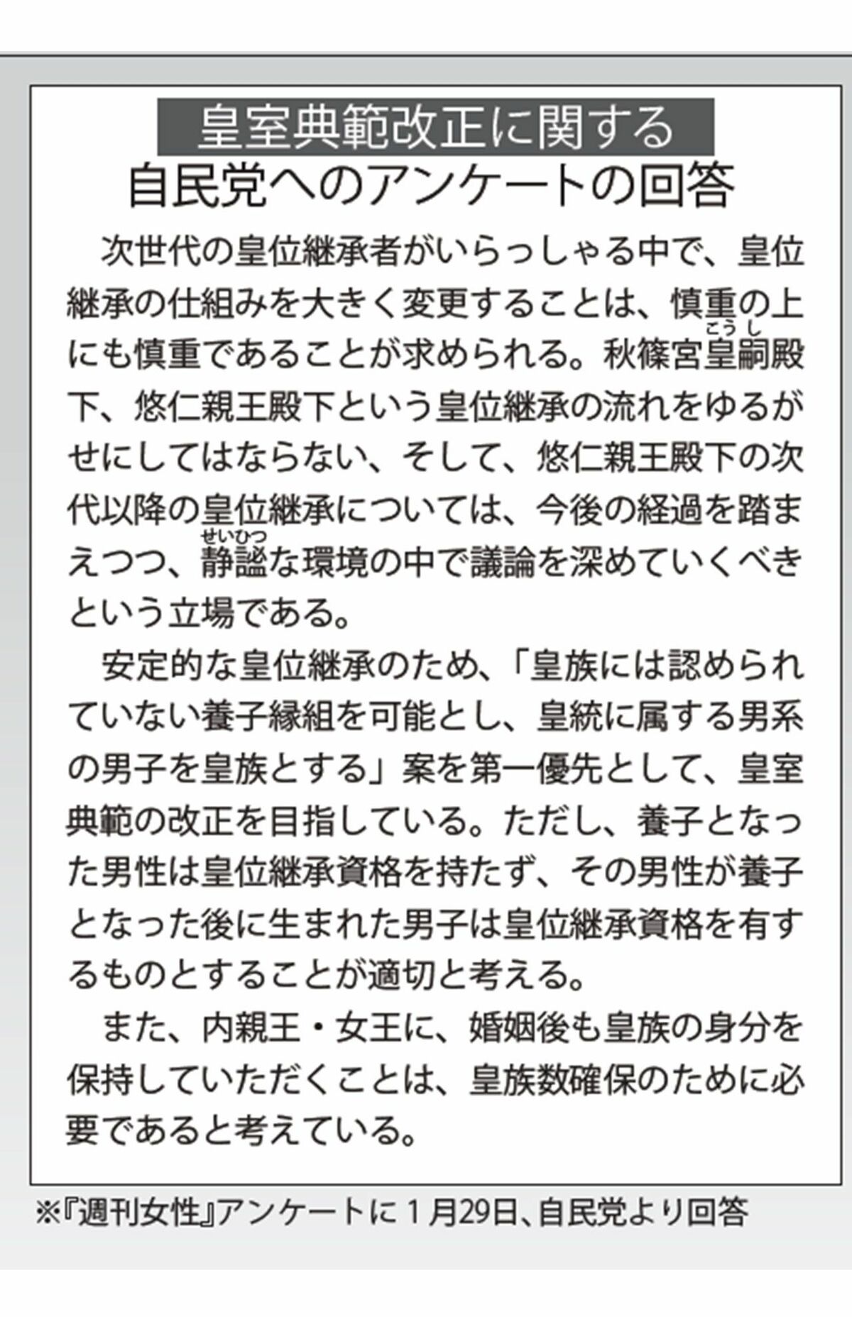 皇室 2026/2/18 自民党圧勝で「愛子天皇論」に暗雲、「道を断つ責任を負えるのか」専門家が「皇室典範改正」で“国民投票”を主張 愛子さま悠仁さま天皇陛下天皇皇后両陛下秋篠宮家上皇上皇后両陛下皇族全般 印刷 [写真 1/33枚目] 24歳を迎えられた愛子さまは、上皇ご夫妻にあいさつするため仙洞御所へ(撮影/JMPA) [写真 2/33枚目] 一般参賀ぶ初めて出席しお手を振る悠仁さま。隣には佳子さまと愛子さま [写真 3/33枚目] 2006年8月 愛子さま初めての海外ご訪問はオランダへ。当時のベアトリクス女王に招待され、ご一家で2週間ほど滞在された。オランダ王室のアマリア王女と愛子さまの微笑ましい交流も話題に(宮内庁提供) [写真 4/33枚目] 2025年6月に沖縄を訪問された際も、仲むつまじいご様子が伝わった雅子さまと愛子さま [写真 5/33枚目] 2009年5月 栃木・御料牧場にご静養に向かう際の宇都宮駅で、愛犬の由莉を優しく雅子さまに手渡す愛子さま。動物病院で保護された犬を譲り受け、愛子さま自らが名付けられた [写真 6/33枚目] 1月23日に行われた皇宮警察の年頭視閲式で雅子さま、愛子さまがご出席された [写真 7/33枚目] 2014年4月 学習院中等科の入学式。スカーフの色が初等科の赤から紺色に変わり、入学を前に「楽しみにしています」とお気持ちを述べられた [写真 8/33枚目] 2017年4月 雨の降る中、ご一家そろって学習院高等科の入学式へ。愛子さまは「先生方やお友達と一緒に、充実した高校生活を過ごしたい」と抱負を語られた [写真 9/33枚目] 2006年9月 東京・両国国技館で大相撲を初めて観戦された愛子さま。取組ごとの結果を星取表に書き込んだりしながら、時折笑顔を見せ、楽しまれている様子だった [写真 10/33枚目] 2008年4月 ご一家で学習院初等科の入学式へ。雅子さまは白のスーツ姿、愛子さまはツインテールの髪形に、赤いスカーフを結んだセーラー服姿を披露し、笑顔で記念撮影を [写真 11/33枚目] 2025年6月 両陛下と愛子さまは、戦後80年の節目の年に沖縄をご訪問。修復中の首里城では、雅子さまと愛子さまがブルーのかりゆしワンピース姿で、リンクコーデを披露し、注目された [写真 12/33枚目] 2009年10月、初等科2年の愛子さまは運動会でチームリレーにご参加。自身のチームが優勝し、ガッツポーズ! [写真 13/33枚目] 2020年3月、学習院高等科の卒業式に臨まれた愛子さま。切りすぎたという前髪は、眉より上でそろえられている [写真 14/33枚目] 仲良しな佳子さまとご一緒の公務も増加中(2025年2月) [写真 15/33枚目] 2024年4月、日本赤十字社に紺色のスーツで初出社された愛子さま [写真 16/33枚目] 2023年9月、東京ドームシティでグループデートを満喫された愛子さま。びしょ濡れになりながら、大学生最後の夏休みを謳歌された [写真 17/33枚目] 初の海外公式訪問だが、リラックスした面持ちで空港を発たれた [写真 18/33枚目] 2006年8月、オランダをご訪問された愛子さま [写真 19/33枚目] 愛子さまはワインレッドのようなシックな色味で [写真 20/33枚目] 佳子さまは紅赤のような正統派な色味、後ろに見えるのは愛子さま [写真 21/33枚目] 2025年秋の園遊会、愛子さまの様子 [写真 22/33枚目] 2022年、初めてのペア公務に臨まれた愛子さまと佳子さま [写真 23/33枚目] 2022年の秋季雅楽演奏会で佳子さまがお召しになった赤いセットアップは今回の園遊会で着用されたものと同じもの [写真 24/33枚目] 昨年の秋の園遊会は和装で臨まれた [写真 25/33枚目] 2025年5月、ウィーン少年合唱団を鑑賞あれる陛下と愛子さま [写真 26/33枚目] 昨年、皇居で開かれたお茶会に出席した際も紅白コーデで臨まれた(宮内庁提供写真) [写真 27/33枚目] 2024年10月、春季雅楽演奏会に臨まれ陛下と愛子さま [写真 28/33枚目] 「皇室典範改正に関する」自民党からのアンケートの回答(『週刊女性』に1月29日、自民党より回答) [写真 29/33枚目] 2月7日、衆院選の街頭演説をおこなった高市早苗首相 [写真 30/33枚目] 黒田清子さんのティアラで成年式を迎えられた愛子さま(撮影/JMPA) [写真 31/33枚目] ペア公務も多くこなされてきた愛子さまと佳子さま [写真 32/33枚目] 2026年1月18日、天覧相撲をご一家で観戦される天皇陛下、雅子さま、愛子さま(写真/JMPA) [写真 33/33枚目] 一般参賀でお手を振る天皇陛下、雅子さま、愛子さま、佳子さま この写真の記事へ戻る