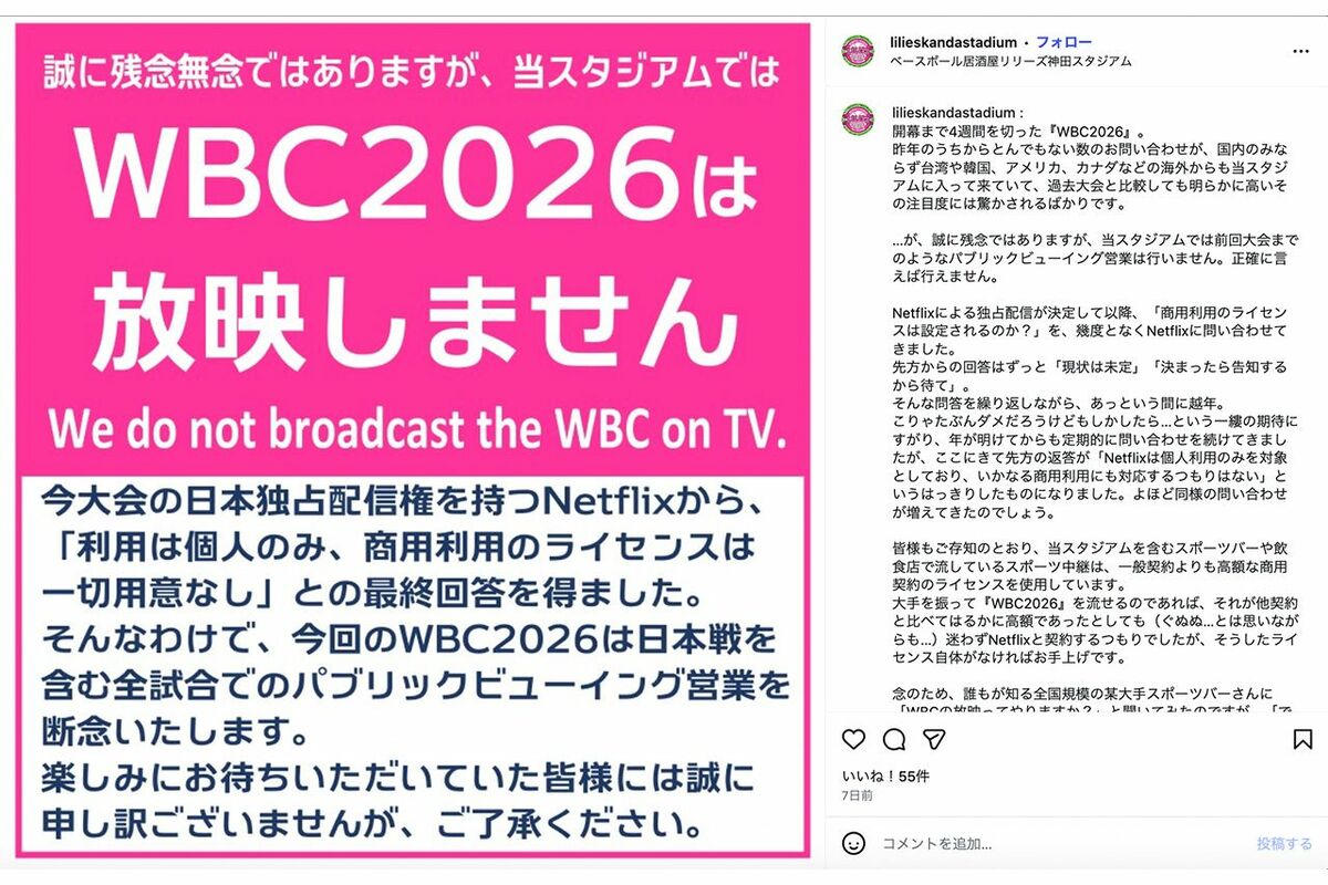 芸能 2026/2/21 大谷翔平出場のWBC2026はパブリックビューイング営業NG!野球居酒屋が直面する〈商用利用の壁〉にNetflix広報が正式回答 Netflix大谷翔平WBCロサンゼルス・ドジャースMLB野球スポーツ日本テレビ居酒屋 印刷 [写真 1/23枚目] 2023年のWBCで日本を世界一へと導いた大谷翔平 [写真 2/23枚目] WBC2026の上映断念を報告した『ベースボール居酒屋リリーズ神田スタジアム』(公式インスタグラムより) [写真 3/23枚目] WBC2026を独占生配信するネットフリックス(公式Xより) [写真 4/23枚目] Netflixが急きょ増設?パブリックビューイングに関する問い合わせフォーム [写真 5/23枚目] 2026年1月8日にデコピンとの写真が投稿された大谷翔平のインスタグラム [写真 6/23枚目] 2025年11月3日に行われたドジャース優勝パレードでの大谷翔平と真美子さん/共同通信 [写真 7/23枚目] 『キリン プラズマ乳酸菌』CMのメイキング映像で“パパの顔”を覗かせた大谷翔平(キリンの公式YouTubeチャンネルより) [写真 8/23枚目] 『Beats by Dre』の新ビジュアルに登場した大谷翔平(本人のインスタグラムより) [写真 9/23枚目] 『Beats by Dre』の新ビジュアルに登場した大谷翔平(本人のインスタグラムより) [写真 10/23枚目] 『ビーツ』公式インスタグラムで質問に答える大谷翔平、好きな食べ物を聞かれて「おにぎり」と答えた [写真 11/23枚目] 2026年2月に発売される大谷翔平の絵本『デコピンのとくべつないちにち』の表紙(ポプラ社のHPより) [写真 12/23枚目] 大谷翔平公式Instagramより [写真 13/23枚目] ムーキー・ベッツ選手がクリスマスに撮影した家族との写真(ドジャース夫人会のインスタグラムより) [写真 14/23枚目] 2019年2月19日、ロサンゼルス・エンゼルス時代にサンタの帽子を被った大谷翔平/産経ビジュアル [写真 15/23枚目] 自身のインスタグラムにてWBCへの参加を表明。前回大会MVPの参戦で日本の連覇への期待が高まる [写真 16/23枚目] 白のトップスを着て写真に収まる真美子さん(ドジャース夫人会のインスタグラム) [写真 17/23枚目] 2025年7月のレッドカーペットで、事前に大谷翔平の妻・真美子さんをヘアセットする動画。美容師のSNSに投稿されていたが現在は削除済み [写真 18/23枚目] 大谷翔平に何か耳打ちするマチャド。二人は笑顔で会話していた(Xより) [写真 19/23枚目] 2026年3月の営業スケジュールにはWBC2026はなく(『ベースボール居酒屋リリーズ神田スタジアム』公式HPより) [写真 20/23枚目] 《日本を代表して再びプレーできることを嬉しく思います》と記し、前回大会時の写真をアップして第6回WBC出場を表明した大谷翔平(本人のインスタグラムより) [写真 21/23枚目] 《日本を代表して再びプレーできることを嬉しく思います》と記し、前回大会時の写真をアップして第6回WBC出場を表明した大谷翔平(本人のインスタグラムより) [写真 22/23枚目] 2023年のWBCでは二刀流で活躍して、MVPも獲得した大谷翔平 [写真 23/23枚目] 3大会ぶりWBC世界一の立役者。決勝戦はリリーフ登板をして優勝投手となり、大会MVPにも輝いた。二刀流で投打に活躍し、雄叫びをあげチームを鼓舞する姿が注目された(写真/共同通信社) この写真の記事へ戻る