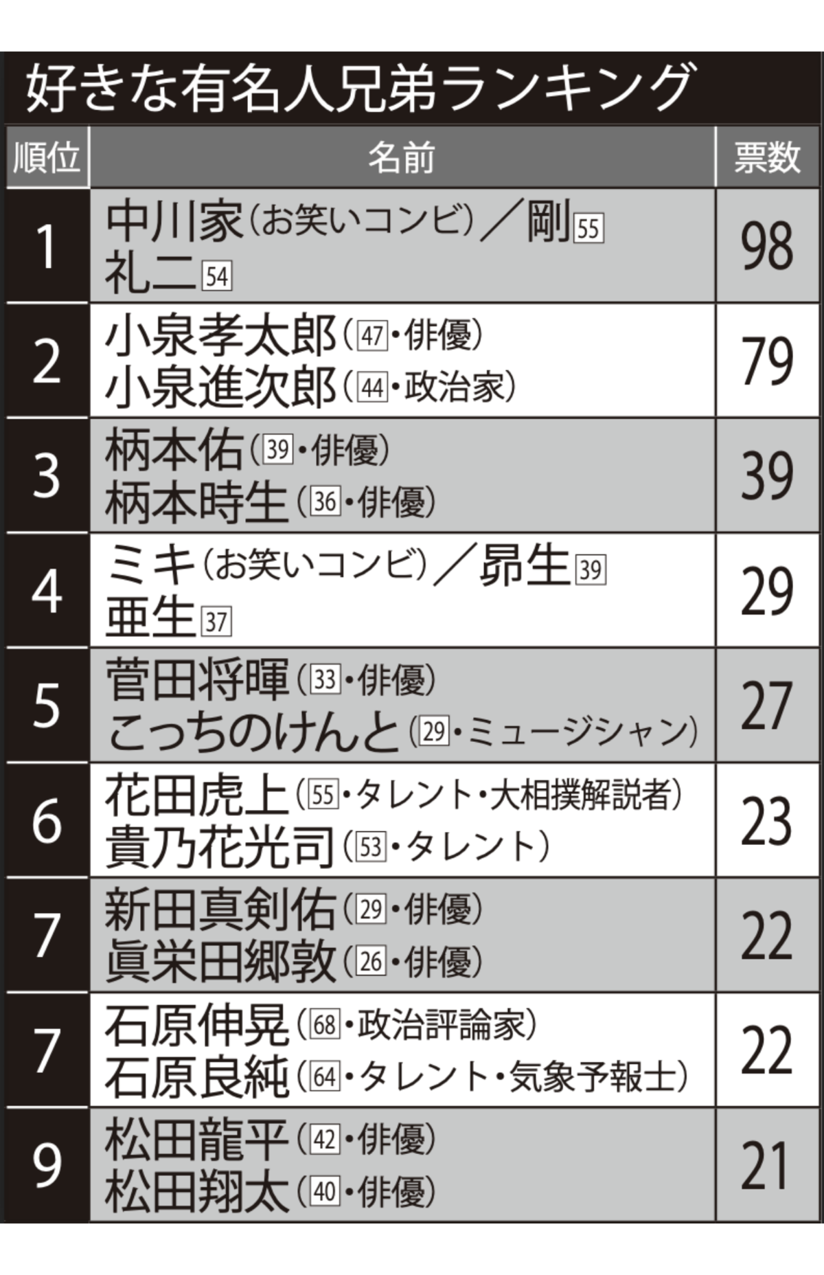 芸能 2026/3/6 《有名人兄弟「好き」ランキング》柄本佑・時生、小泉進次郎兄弟を抑えた1位は中川家「仲の良さが感じられる」 菅田将暉小泉進次郎小泉孝太郎柄本時生柄本佑新田真剣佑眞栄田郷敦石原良純松田翔太アーティスト松田龍平男優お笑い芸人タレント 印刷 [写真 1/16枚目] 好きな有名人兄弟ランキングTOP10 [写真 2/16枚目] 左から菅田将暉と弟でアーティストの『こっちのけんと』 [写真 3/16枚目] 「ミキ」の亜生と昴生 [写真 4/16枚目] 角替さんと柄本明の長男・佑と次男・時生も、父と並んで [写真 5/16枚目] 小泉孝太郎(中)は、父が元内閣総理大臣小泉純一郎氏(左)、弟が衆議院議員の小泉進次郎(右) [写真 6/16枚目] 好きな有名人兄弟ランキングTOP10 [写真 7/16枚目] 「中川家」 [写真 8/16枚目] 小泉孝太郎 [写真 9/16枚目] 警視庁捜査一課の警部役を演じる小泉孝太郎(ドラマ9『失踪人捜索班 消えた真実』公式サイトより) [写真 10/16枚目] NHK大河ドラマ『光る君へ』で「お似合い」と評判だった吉高由里子、柄本佑 [写真 11/16枚目] 結婚を報告した柄本時生とさとうほなみ(柄本時生本人インスタグラムより) [写真 12/16枚目] 柄本時生 [写真 13/16枚目] 菅田将暉 [写真 14/16枚目] 菅田将暉 [写真 15/16枚目] 『しゃべくり007』に出演したこっちのけんと(番組公式Xより) [写真 16/16枚目] 『しゃべくり007』に出演したこっちのけんと(番組公式Xより) この写真の記事へ戻る
