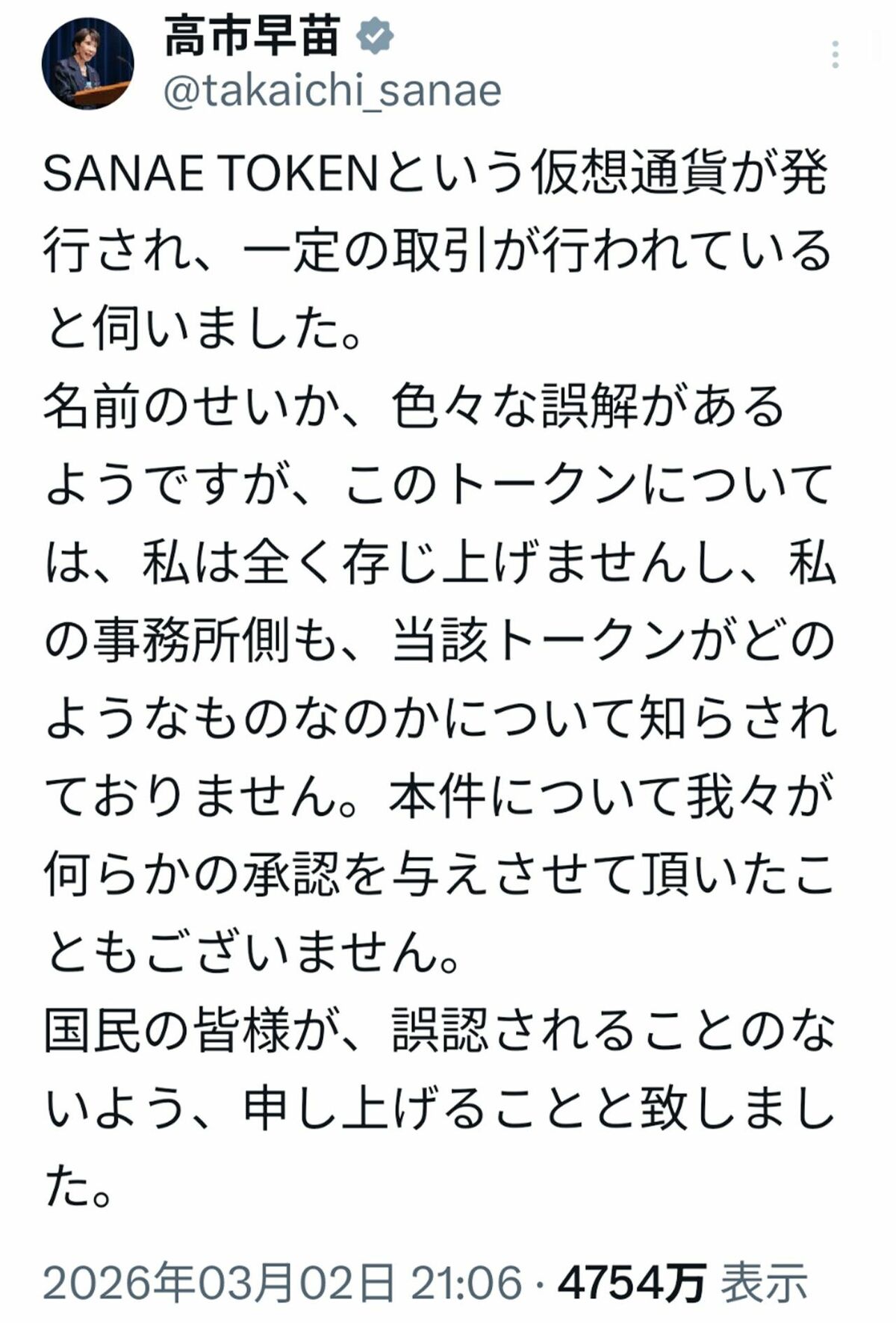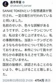 社会・事件 2026/3/3 高市早苗首相の名前を勝手に使った仮想通貨「SANAE TOKEN」高騰から一転暴落…混乱する運営に失望の声 高市早苗堀江貴文仮想通貨政治経済投資SNS 印刷 [写真 1/16枚目] 18日、首相官邸で会見を開いた高市早苗内閣総理大臣(撮影/JMPA) [写真 2/16枚目] 高市早苗首相 [写真 3/16枚目] 2月7日、衆院選の街頭演説をおこなった高市早苗首相 [写真 4/16枚目] 高市早苗総理大臣、就任後初の会見(2025年10月21日) [写真 5/16枚目] 高市早苗総理大臣、就任後初の会見(2025年10月21日) [写真 6/16枚目] 高市早苗総理大臣、就任後初の会見(2025年10月21日) [写真 7/16枚目] 「SANAE TOKEN」に関する高市早苗首相のSNS投稿(首相の公式Xより) [写真 8/16枚目] 18日より発足した第2次高市内閣(撮影/JMPA) [写真 9/16枚目] 18日、首相官邸で会見を開いた高市早苗内閣総理大臣(撮影/JMPA) [写真 10/16枚目] 所信表明演説を行う高市早苗内閣総理大臣 写真/共同通信 [写真 11/16枚目] ホリエモンこと堀江貴文 [写真 12/16枚目] 2014年、『たかの友梨CUP』チャリティーゴルフに参加した堀江貴文氏1 [写真 13/16枚目] 2014年、『たかの友梨CUP』チャリティーゴルフに参加した堀江貴文氏3 [写真 14/16枚目] ブレイキングダウンの仕掛け人で起業家の溝口勇児とのツーショット(Xより) [写真 15/16枚目] 代表の溝口勇児も「決して」と激怒(Xより) [写真 16/16枚目] 主要な暗号資産の種類 この写真の記事へ戻る