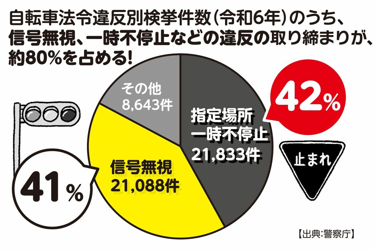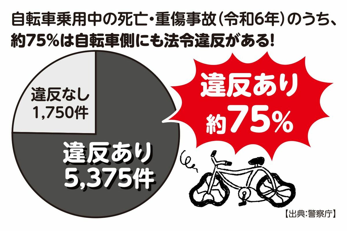 トレンド 2026/3/22 《自転車に青切符導入》4月から取り締まり強化、ながらスマホ・歩道走行・並走…注意すべき“やりがち”違反行為 法律弁護士事故車スマホ犯罪お金警察流行事件 印刷 [写真 1/13枚目] ※写真はイメージです [写真 2/13枚目] 自転車乗車中の死亡・重傷事故(令和6年)のうち、約75%は自転車側にも法令違反がある! [写真 3/13枚目] 自転車法令違反検挙件数(令和6年)のうち、信号無視、一時不停止などの違反の取り締まりが、約80%を占める! [写真 4/13枚目] イラスト/大塚さやか [写真 5/13枚目] イラスト/大塚さやか [写真 6/13枚目] イラスト/大塚さやか [写真 7/13枚目] イラスト/大塚さやか [写真 8/13枚目] イラスト/大塚さやか [写真 9/13枚目] イラスト/大塚さやか [写真 10/13枚目] イラスト/大塚さやか [写真 11/13枚目] イラスト/大塚さやか [写真 12/13枚目] 藤吉修崇さん●弁護士・税理士。弁護士法人ATB代表。YouTubeチャンネル「二番煎じと言われても」や著書『交通トラブル六法』(KADOKAWA)を通じて道路交通法なあどについて解説。 [写真 13/13枚目] イラスト/大塚さやか この写真の記事へ戻る
