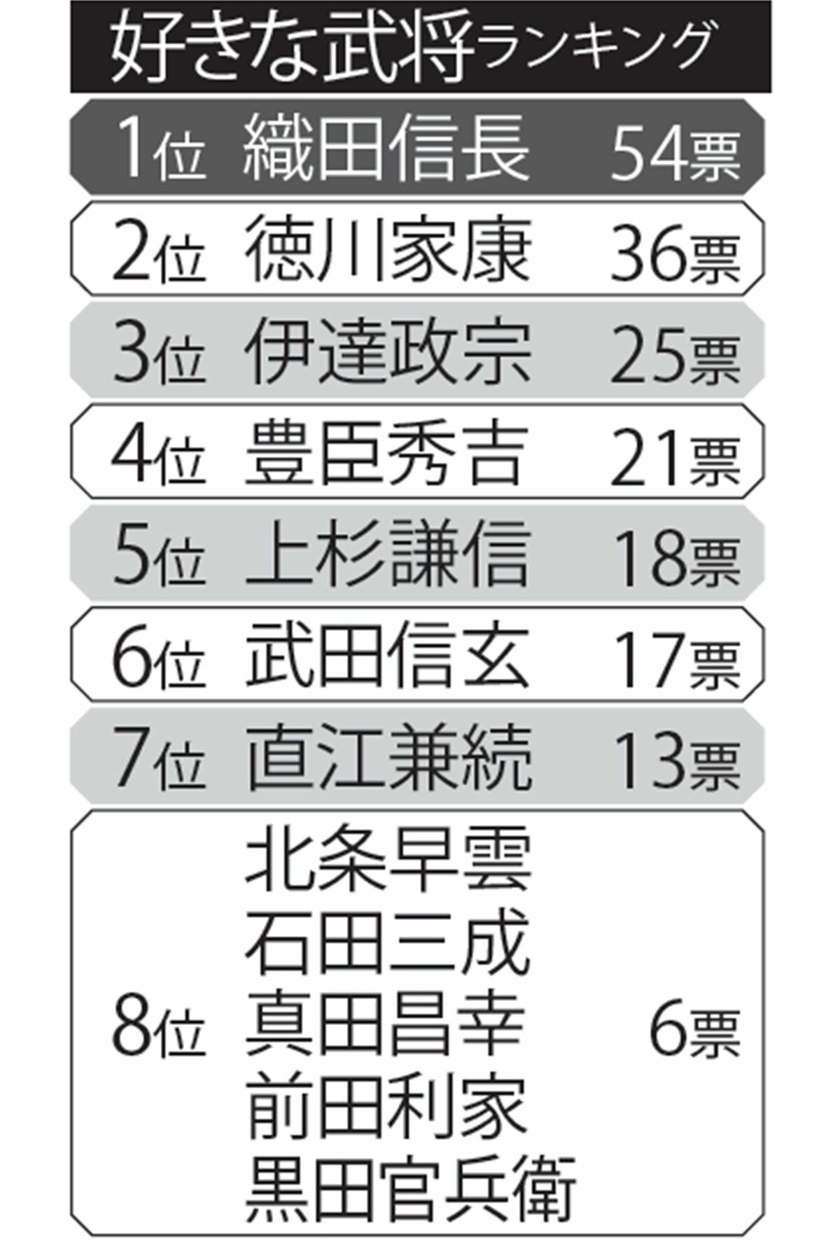 トレンド 2026/3/22 《好きな戦国武将ランキング》NHK大河ドラマ『豊臣兄弟!』の秀吉を抑えた圧倒的人気1位は“戦国時代のイケメン”織田信長 NHK大河ドラマランキング織田信長歴史人物テレビ番組流行 印刷 [写真 1/10枚目] 岐阜駅前の織田信長像 [写真 2/10枚目] 徳川家康像 [写真 3/10枚目] 300人に聞いた、好きな武将ランキング [写真 4/10枚目] NHK大河ドラマでこれまでに豊臣秀吉を演じた主な俳優 [写真 5/10枚目] 仙台城跡にある伊達政宗公騎馬像 [写真 6/10枚目] 織田信長 若いころ、派手な身なりで奇行が目立った信長は「大うつけ」と言われたが、今やリーダー像として人気に [写真 7/10枚目] 木村拓哉らが参加する騎馬武者行列は、信長像が経つ岐阜駅前から延びる金華橋通りで行われる [写真 8/10枚目] 徳川家康 三河を平定し、関ヶ原の戦いを経て征夷大将軍に。戦国の世に終止符を打って江戸幕府を開いた家康 [写真 9/10枚目] 伊達政宗 伊達家の17代当主。大名として優れた才能を持ち、あと20年早く生まれていれば天下を取れたとも [写真 10/10枚目] 豊臣秀吉 一般には下層階級の生まれと考えられているが、秀吉の出自については明確なものはない この写真の記事へ戻る