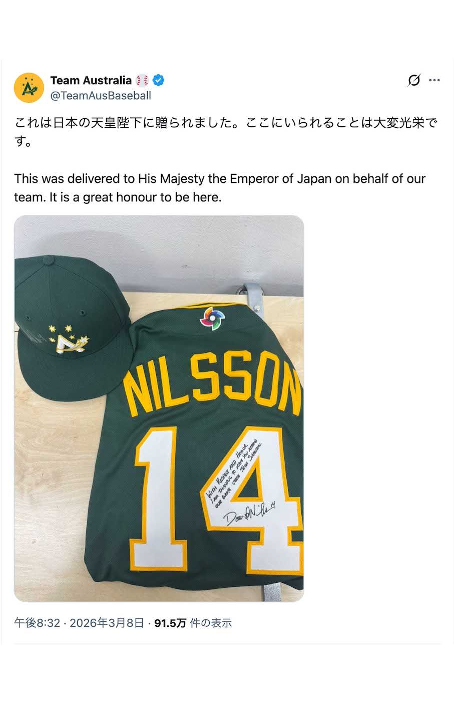 芸能 2026/3/9 【WBC】天覧試合で大谷翔平・吉田正尚らが見せた“敬意”に国民感服、豪州代表から天皇陛下への“寄贈”も話題 WBC天皇皇后両陛下天皇陛下陛下愛子さま雅子さま大谷翔平日本代表スポーツ野球 印刷 [写真 1/40枚目] 3月8日、東京ドームにWBCの観戦に訪れた天皇ご一家(撮影/JMPA) [写真 2/40枚目] WBCオーストラリア代表から天皇陛下に贈られた、同チームのニルソン監督のメッセージ入りユニフォームと帽子(チームの公式Xより) [写真 3/40枚目] 村上宗隆 [写真 4/40枚目] 周東佑京 [写真 5/40枚目] 森下翔太 [写真 6/40枚目] 伊藤大海 [写真 7/40枚目] WBCオフィシャルストアお披露目で「背番号51」のTシャツではしゃぐ川崎宗則(公式インスタグラムより) [写真 8/40枚目] WBC日本代表“侍ジャパン”の井端弘和監督 [写真 9/40枚目] 《日本を代表して再びプレーできることを嬉しく思います》と記し、前回大会時の写真をアップして第6回WBC出場を表明した大谷翔平(本人のインスタグラムより) [写真 10/40枚目] 《日本を代表して再びプレーできることを嬉しく思います》と記し、前回大会時の写真をアップして第6回WBC出場を表明した大谷翔平(本人のインスタグラムより) [写真 11/40枚目] 《日本を代表して再びプレーできることを嬉しく思います》と記し、前回大会時の写真をアップして第6回WBC出場を表明した大谷翔平(本人のインスタグラムより) [写真 12/40枚目] 《日本を代表して再びプレーできることを嬉しく思います》と記し、前回大会時の写真をアップして第6回WBC出場を表明した大谷翔平(本人のインスタグラムより) [写真 13/40枚目] 《日本を代表して再びプレーできることを嬉しく思います》と記し、前回大会時の写真をアップして第6回WBC出場を表明した大谷翔平(本人のインスタグラムより) [写真 14/40枚目] 《日本を代表して再びプレーできることを嬉しく思います》と記し、前回大会時の写真をアップして第6回WBC出場を表明した大谷翔平(本人のインスタグラムより) [写真 15/40枚目] 2023年のWBCで日本を世界一へと導いた大谷翔平 [写真 16/40枚目] 2023年のWBCでは二刀流で活躍して、MVPも獲得した大谷翔平 [写真 17/40枚目] '23年のWBCでは投手としても活躍した大谷翔平 [写真 18/40枚目] 2023年3月の『WBC』で解説を務めた王貞治氏 [写真 19/40枚目] 2023年3月11日のWBC中国戦前、言葉をかわす大谷翔平とダルビッシュ有 [写真 20/40枚目] 2023年、WBCに向け片道4000万円超えのチャーター機で帰国した大谷(本人のインスタグラムより) [写真 21/40枚目] 3月のWBCの試合中に大谷は近藤健介と資料を確認。そのリーダー力で世界一に導いた [写真 22/40枚目] WBC時の山川穂高(中央)と西武でも同僚の源田壮亮(左)。右隣は大谷翔平 [写真 23/40枚目] WBC時の山川穂高選手と大谷翔平選手 [写真 24/40枚目] WBCで戦況を見つめる大谷翔平。ウォーミングアップにも余念がない [写真 25/40枚目] 2023年3月9日、WBC中国戦に出場した大谷翔平 [写真 26/40枚目] 2023年3月9日、WBC中国戦に出場した大谷翔平 [写真 27/40枚目] 2023年3月10日、WBC韓国戦に出場した大谷翔平 [写真 28/40枚目] WBC優勝後に感謝を綴った村上宗隆(本人インスタグラムより) [写真 29/40枚目] WBC優勝後の記念撮影(大谷翔平のインスタグラムより) [写真 30/40枚目] WBC準々決勝、イタリア戦での大谷翔平(撮影:北村史成) [写真 31/40枚目] 3月9日、WBC日本代表の開幕戦である中国戦に二刀流で出場した大谷翔平(撮影:渡邉智裕) [写真 32/40枚目] 3月8日、東京ドームにWBCの観戦に訪れた天皇ご一家。説明役は栗山秀樹氏(撮影/JMPA) [写真 33/40枚目] 3月8日、東京ドームにWBCの観戦に訪れた愛子さま(撮影/JMPA) [写真 34/40枚目] 3月8日、東京ドームにWBCの観戦に訪れた天皇ご一家。天皇陛下、雅子さま、愛子さまはブルーのリンクコーデをされていた(撮影/JMPA) [写真 35/40枚目] 3月3日に主婦と生活社より発売された『世界一やさしい2026WBCビギナーズガイド』 [写真 36/40枚目] 「ラストサムライ」の文言を添え、野手で唯一WBC未出場の小園海斗とのグータッチ写真を公開した大谷翔平(本人のインスタグラムより) [写真 37/40枚目] WBC2026チェコ代表の集合写真 [写真 38/40枚目] WBCチェコ代表(チェコセンター東京公式サイトより) [写真 39/40枚目] 大谷翔平 [写真 40/40枚目] 山本由伸 この写真の記事へ戻る