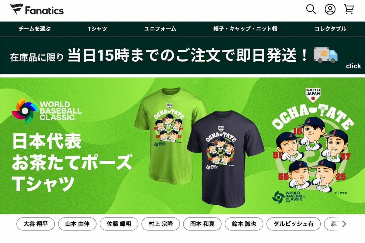 芸能 2026/3/10 WBC2026侍ジャパン「お茶たてポーズ」が公式グッズ化も、大谷翔平らプリントのTシャツから“ハブられた”吉田正尚 WBC大谷翔平日本代表スポーツ野球 印刷 [写真 1/21枚目] 2026年3月6日の台湾戦、満塁ホームランを放って「お茶たてポーズ」をする大谷翔平 [写真 2/21枚目] 2026年3月6日の台湾戦、満塁ホームランを放った大谷翔平と「お茶たてポーズ」で出迎える北山亘基 [写真 3/21枚目] 『ファナティクス・ジャパン』が販売する「お茶たてポーズTシャツ」(公式HPより) [写真 4/21枚目] 村上宗隆 [写真 5/21枚目] 周東佑京 [写真 6/21枚目] 森下翔太 [写真 7/21枚目] 伊藤大海 [写真 8/21枚目] WBCオフィシャルストアお披露目で「背番号51」のTシャツではしゃぐ川崎宗則(公式インスタグラムより) [写真 9/21枚目] WBC日本代表“侍ジャパン”の井端弘和監督 [写真 10/21枚目] 《日本を代表して再びプレーできることを嬉しく思います》と記し、前回大会時の写真をアップして第6回WBC出場を表明した大谷翔平(本人のインスタグラムより) [写真 11/21枚目] テレビでネットで街で……至るところで“大谷広告”(『お~いお茶』伊藤園公式YouTubeより) [写真 12/21枚目] WBCオーストラリア代表から天皇陛下に贈られた、同チームのニルソン監督のメッセージ入りユニフォームと帽子(チームの公式Xより) [写真 13/21枚目] 3月8日、東京ドームにWBCの観戦に訪れた天皇ご一家。説明役は栗山秀樹氏(撮影/JMPA) [写真 14/21枚目] 3月8日、東京ドームにWBCの観戦に訪れた愛子さま(撮影/JMPA) [写真 15/21枚目] 3月8日、東京ドームにWBCの観戦に訪れた天皇ご一家。天皇陛下、雅子さま、愛子さまはブルーのリンクコーデをされていた(撮影/JMPA) [写真 16/21枚目] 3月3日に主婦と生活社より発売された『世界一やさしい2026WBCビギナーズガイド』 [写真 17/21枚目] 「ラストサムライ」の文言を添え、野手で唯一WBC未出場の小園海斗とのグータッチ写真を公開した大谷翔平(本人のインスタグラムより) [写真 18/21枚目] WBC2026チェコ代表の集合写真 [写真 19/21枚目] WBCチェコ代表(チェコセンター東京公式サイトより) [写真 20/21枚目] 大谷翔平 [写真 21/21枚目] 山本由伸 この写真の記事へ戻る