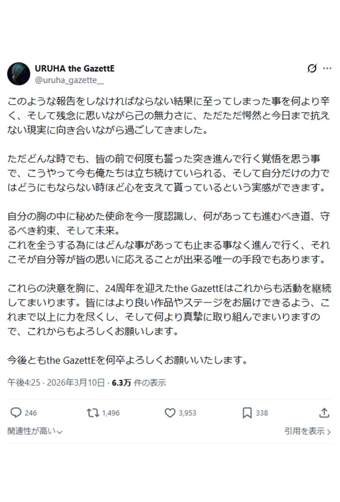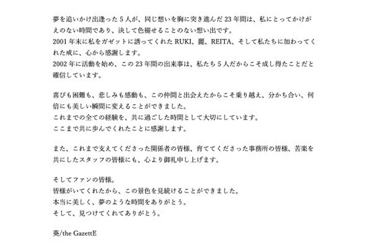 芸能 2026/3/11 『the GazettE』脱退のギター・葵「除名処分ではない」内紛トラブルの事務所と食い違う主張に深まる“謎” バンドアーティストトラブルパワハラ解散慰謝料 印刷 [写真 1/15枚目] ヴィジュアル系ロックバンド『theGazettE』からの除名が発表されたギタリスト・葵(本人のXより) [写真 2/15枚目] 2026年3月上旬、事務所をめぐるトラブルや脱退について本誌に答えた『theGazettE』の葵 [写真 3/15枚目] 「今日をもってthe GazettEは4人となります」と報告したメンバーのRUKIの投稿1(公式サイトより) [写真 4/15枚目] 「今日をもってthe GazettEは4人となります」と報告したメンバーのRUKIの投稿2(公式サイトより) [写真 5/15枚目] 『the GazettE』メンバー・麗の投稿(本人Xより) [写真 6/15枚目] 『the GazettE』メンバー・KAIの投稿(本人Xより) [写真 7/15枚目] スウェットパンツにパーカーのかなりラフな服装だったギターの葵 [写真 8/15枚目] 2026年2月中旬、『theGazettE』が使用する倉庫から自身の荷物を取り出す葵(左)。その後、荷物は楽器店に搬入された [写真 9/15枚目] 記者の直撃に答えるギター・葵 [写真 10/15枚目] 記者の直撃に答えるギター・葵 [写真 11/15枚目] 記者の直撃に答えるギター・葵 [写真 12/15枚目] ヴィジュアル系ロックバンド『theGazettE』からの除名について“反論声明”を投稿したギタリスト・葵(本人のXより) [写真 13/15枚目] ギタリスト・葵の除名について投稿したヴィジュアル系ロックバンド『theGazettE』(公式Xより) [写真 14/15枚目] 3月10日、ギター・葵の脱退を報告した『theGazettE』(公式サイトより) [写真 15/15枚目] ワールドツアーを成功させる実力派ヴィジュアル系ロックバンド『theGazettE』(公式HPより) この写真の記事へ戻る