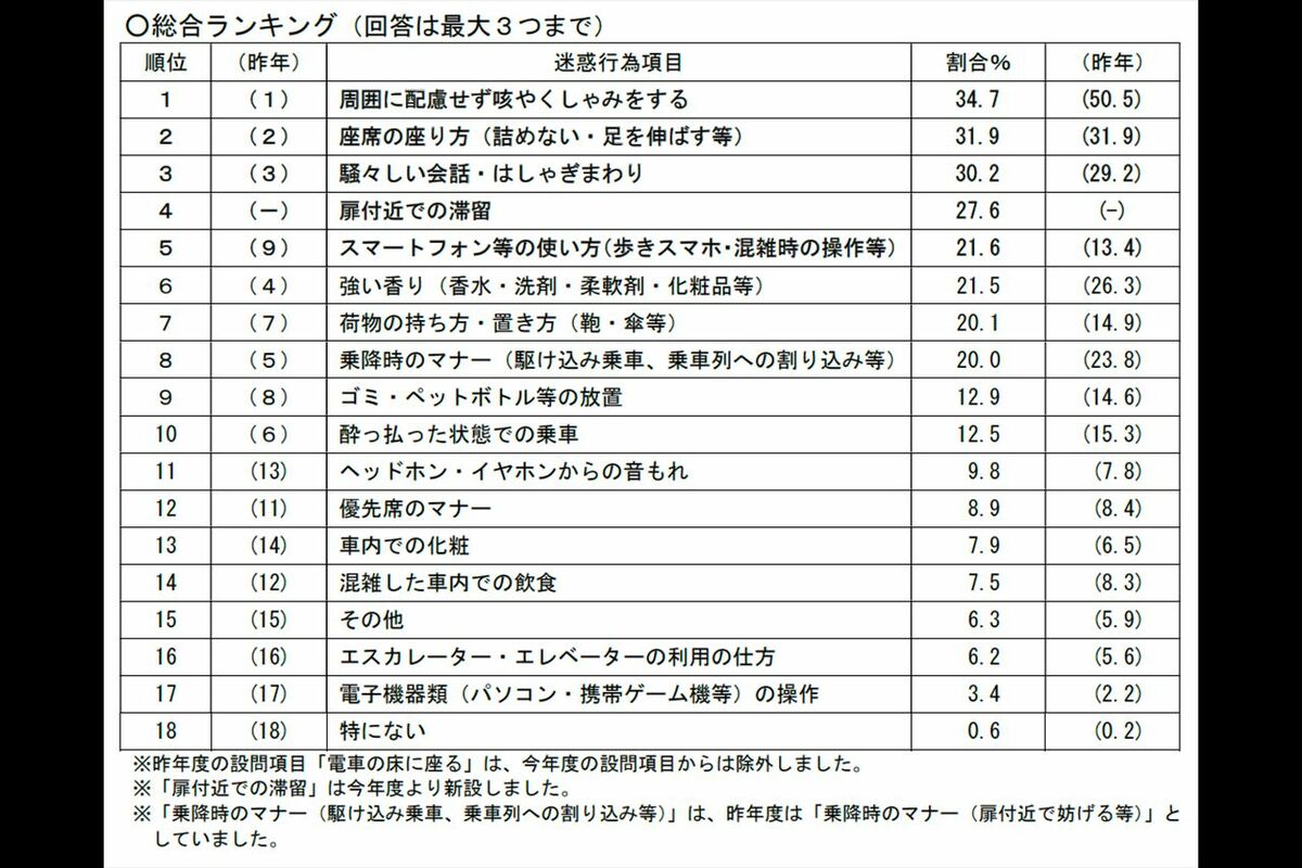 ライフ 2026/3/20 日本民営鉄道協会発表の「迷惑行為ランキング」で〈満員電車の相席ブロック〉に続く新ワード〈狛犬行為〉が4位の衝撃 鉄道ビジネスマナー迷惑行為 印刷 [写真 1/24枚目] 混雑時の電車は特にマナーを守って利用したい(写真はイメージです) 撮影/編集部 [写真 2/24枚目] 京王バスの「2席ひとりじめシート」イメージ 写真提供/京王電鉄バス [写真 3/24枚目] 京王バスの「2席ひとりじめシート」イメージ 写真提供/京王電鉄バス [写真 4/24枚目] 京王バスの「2席ひとりじめシート」プランで提供されるアメニティ 写真提供/京王電鉄バス [写真 5/24枚目] 品川駅構内にある鉄道グッズ専門店『BLUE BULLET』で抽選販売された新幹線車両の車掌スイッチ(公式Xより) [写真 6/24枚目] 抽選販売された新幹線車両の車掌スイッチについて「価格を再検討し改めて販売時期をご案内致します」などと謝罪した『BLUE BULLET』(公式Xより) [写真 7/24枚目] 東北新幹線とのコラボ『Enjoy! SixTONES, Enjoy! ShinKANSEN.』キャンペーンに起用されたSixTONES。JR大宮駅には特大ポスターが 撮影/編集部 [写真 8/24枚目] 新潟新幹線(写真はイメージです) 撮影/編集部 [写真 9/24枚目] 秋田新幹線の車内 撮影/編集部 [写真 10/24枚目] 東海道新幹線 撮影/編集部 [写真 11/24枚目] 東海道新幹線 撮影/編集部 [写真 12/24枚目] 東海道新幹線 撮影/編集部 [写真 13/24枚目] 東海道新幹線 撮影/編集部 [写真 14/24枚目] 東海道新幹線 撮影/編集部 [写真 15/24枚目] 一般社団法人日本民営鉄道協会が調査した『2025年度駅と電車内の迷惑行為ランキング』の結果 [写真 16/24枚目] 新幹線でマナー違反だと思うランキング [写真 17/24枚目] 新幹線車内にある特大のキャリーケース置き場は予約が必要 [写真 18/24枚目] X上で波紋を呼んだJR高崎線グリーン車デッキのベビーカー放置投稿 [写真 19/24枚目] SixTONES発車メロディー企画がスタートした10月1日、上越新幹線ホームで迷惑行為を行う音鉄グループ(Xより、写真加工は編集部によるもの) [写真 20/24枚目] 撮り鉄たちのお目当てだった“救護車”(Xで拡散されている動画のスクリーンショット) [写真 21/24枚目] 線路内に脚立を持ち込むなど、レア車両を狙い集まった“撮り鉄”(Xで拡散されている動画のスクリーンショット) [写真 22/24枚目] 遮断機から身を乗り出し車両を撮影しようとする撮り鉄(Xで拡散されている動画のスクリーンショット) [写真 23/24枚目] '10年に撮り鉄と思われる男性の死亡事故があった崖。ほぼ断崖絶壁 [写真 24/24枚目] 話題になった投稿1(拡散されている投稿より) この写真の記事へ戻る