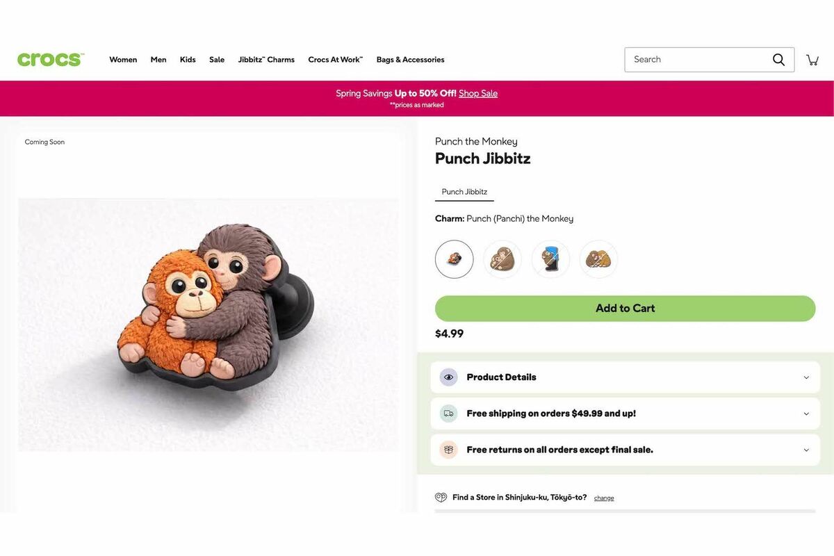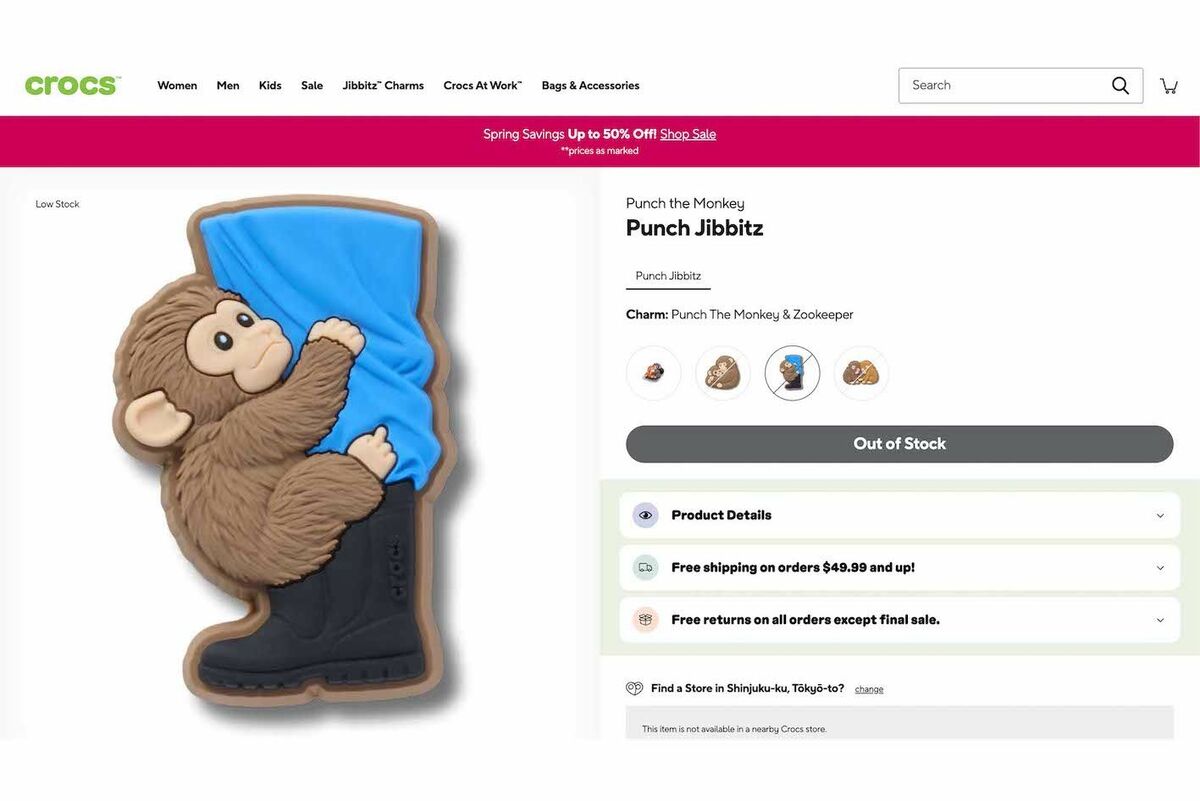 トレンド 2026/3/30 市川市動植物園「パンチくん」クロックスが“非公認”グッズ新作を追加販売で波紋、ファンの怒りを企業に直撃 動物園動物ビジネス著作権流行 印刷 [写真 1/22枚目] 千葉県・市川市動植物園のパンチくん(公式Xより) [写真 2/22枚目] 「PunchJibbitz」という名前もそうだが、市川市動植物園のパンチを明確に想起させるデザインの商品。さらに追加販売される模様(クロックスのオンラインショップより) [写真 3/22枚目] 飼育員にしがみつく子ザルのパンチくん(写真/読者提供) [写真 4/22枚目] オランママに抱きついて安心したのかスヤスヤと眠るパンチくん(写真/読者提供) [写真 5/22枚目] ごはんを食べている仲間に、ちょっかいを出しにいくわんぱくで甘えん坊なパンチ(写真/読者提供) [写真 6/22枚目] 子ザルのパンチくん(写真/読者提供) [写真 7/22枚目] 飼育員さんがやってくると、脚や腕に抱きついて離れないパンチ。時には、飼育員さんの膝の上や肩の上でごはんを食べることも(写真/読者提供) [写真 8/22枚目] パンチの母代わりとして行動を共にしているオランウータンのぬいぐるみ、通称「オランママ」よく引きずられたり踏んづけられたりしている(写真/読者提供) [写真 9/22枚目] 子ザルのパンチくん(写真/読者提供) [写真 10/22枚目] 子ザルのパンチくん(写真/読者提供) [写真 11/22枚目] 最近は群れになじんできたパンチ。仲間とハグする様子も(写真/読者提供) [写真 12/22枚目] 飼育員さんがやってくると、脚や腕に抱きついて離れないパンチ。時には、飼育員さんの膝の上や肩の上でごはんを食べることも(写真/読者提供) [写真 13/22枚目] 子ザルのパンチくん(写真/読者提供) [写真 14/22枚目] 子ザルのパンチくん(写真/読者提供) [写真 15/22枚目] 「PunchJibbitz」という名前もそうだが、市川市動植物園のパンチを明確に想起させるデザインの商品。さらに追加販売される模様(クロックスのオンラインショップより) [写真 16/22枚目] 「PunchJibbitz」という名前もそうだが、市川市動植物園のパンチを明確に想起させるデザインの商品(クロックスのオンラインショップより) [写真 17/22枚目] 「PunchJibbitz」という名前もそうだが、市川市動植物園のパンチを明確に想起させるデザインの商品(クロックスのオンラインショップより) [写真 18/22枚目] 公開している「#がんばれパンチサポーターズガイド」(公式サイトより) [写真 19/22枚目] Googleで『パンチくん』と検索すると特殊な演出が発生する [写真 20/22枚目] パンチくんが母親代わりに愛用するオランウータンのぬいぐるみ(イケア公式サイトより) [写真 21/22枚目] 千葉県・市川市動植物園のパンチくん(公式Xより) [写真 22/22枚目] 母親がわりのぬいぐるみを抱くパンチくん(市川市動植物園の公式Xより) この写真の記事へ戻る