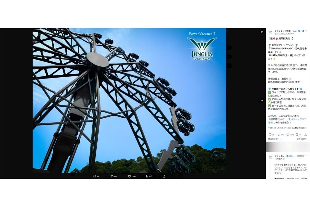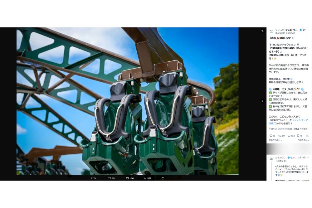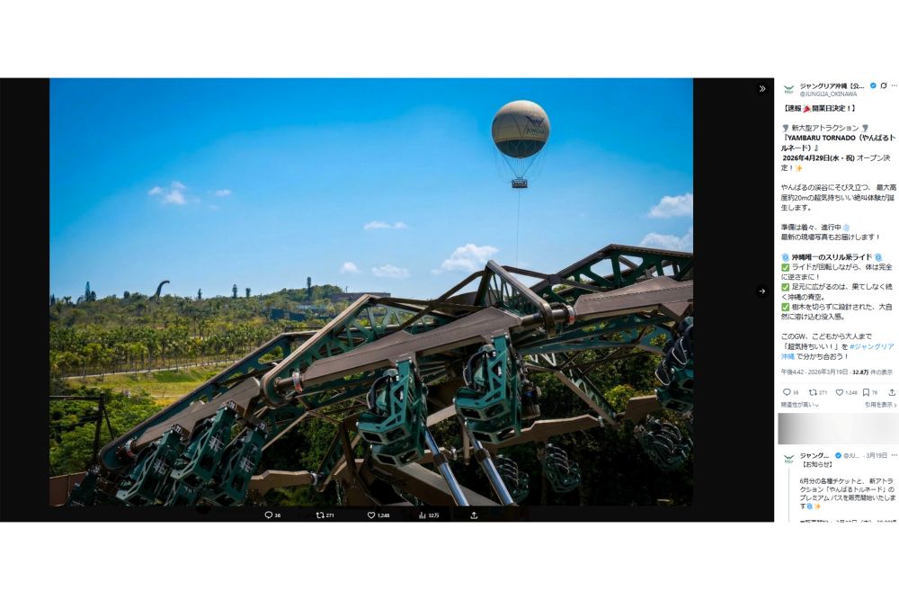 トレンド 2026/3/26 ジャングリア沖縄、ゴールデンウィークに『やんばるトルネード』始動!経営不振の声の中、GWは絶叫系で巻き返しなるか ジャングリア沖縄沖縄遊園地家族KAT-TUN中丸雄一霜降り明星仲里依紗流行ビジネス 印刷 [写真 1/31枚目] ジャングリア沖縄(公式Xより) [写真 2/31枚目] 4月29日から運行が始まる『やんばるトルネード』(『ジャングリア』公式Xより) [写真 3/31枚目] 『ジャングリア沖縄』の実際の様子(Xより) [写真 4/31枚目] 『ジャングリア沖縄』のイメージ画像(公式サイトより) [写真 5/31枚目] 『ジャングリア沖縄』の実際の様子(Xより) [写真 6/31枚目] 『ジャングリア沖縄』の実際の様子(Xより) [写真 7/31枚目] 『ジャングリア沖縄』のイメージ画像(公式インスタグラムより) [写真 8/31枚目] 『ジャングリア沖縄』のアトラクション(公式サイトより) [写真 9/31枚目] 『ジャングリア沖縄』のアトラクション(公式サイトより) [写真 10/31枚目] 『ジャングリア沖縄』のアトラクション(公式サイトより) [写真 11/31枚目] 『ジャングリア沖縄』のアトラクション(公式サイトより) [写真 12/31枚目] 『ジャングリア沖縄』のアトラクション(公式サイトより) [写真 13/31枚目] 『ジャングリア沖縄』のアトラクション(公式サイトより) [写真 14/31枚目] 『ジャングリア沖縄』のアトラクション(公式サイトより) [写真 15/31枚目] 『ジャングリア沖縄』のアトラクション(公式サイトより) [写真 16/31枚目] 『ジャングリア沖縄』(公式サイトより) [写真 17/31枚目] パノラマ ダイニングのイメージ図(ジャングリア沖縄公式サイトより) [写真 18/31枚目] ダイナソーサファリのイメージ図(ジャングリア沖縄公式サイトより) [写真 19/31枚目] 園内マップ(ジャングリア沖縄公式サイトより) [写真 20/31枚目] レストランメニュー(ジャングリア沖縄公式サイトより) [写真 21/31枚目] 4月29日から運行が始まる『やんばるトルネード』(『ジャングリア』公式Xより) [写真 22/31枚目] ジャングリアの新アトラクション『やんばるトルネード』(公式サイト) [写真 23/31枚目] 4月29日から運行が始まる『やんばるトルネード』(『ジャングリア』公式Xより) [写真 24/31枚目] プレミアムパスの価格(『ジャングリア』公式サイトより) [写真 25/31枚目] 人気アトラクション『ダイナソーサファリ』(『ジャングリア』公式サイトより) [写真 26/31枚目] 1月24日から始まるジャングリア沖縄の新アトラクション『グラビティ ドロップ』(公式サイトより) [写真 27/31枚目] 2025年の大晦日に『ジャングリア沖縄』を訪れた人は、混雑した様子を報告している(Xより) [写真 28/31枚目] 開業から約4か月後のジャングリア沖縄(旅系YouTuber『転生のぶりん』チャンネルより) [写真 29/31枚目] 開業から約4か月後のジャングリア沖縄(旅系YouTuber『転生のぶりん』チャンネルより) [写真 30/31枚目] 開業から約4か月後のジャングリア沖縄(旅系YouTuber『転生のぶりん』チャンネルより) [写真 31/31枚目] 開業から約4か月後のジャングリア沖縄(旅系YouTuber『転生のぶりん』チャンネルより) この写真の記事へ戻る