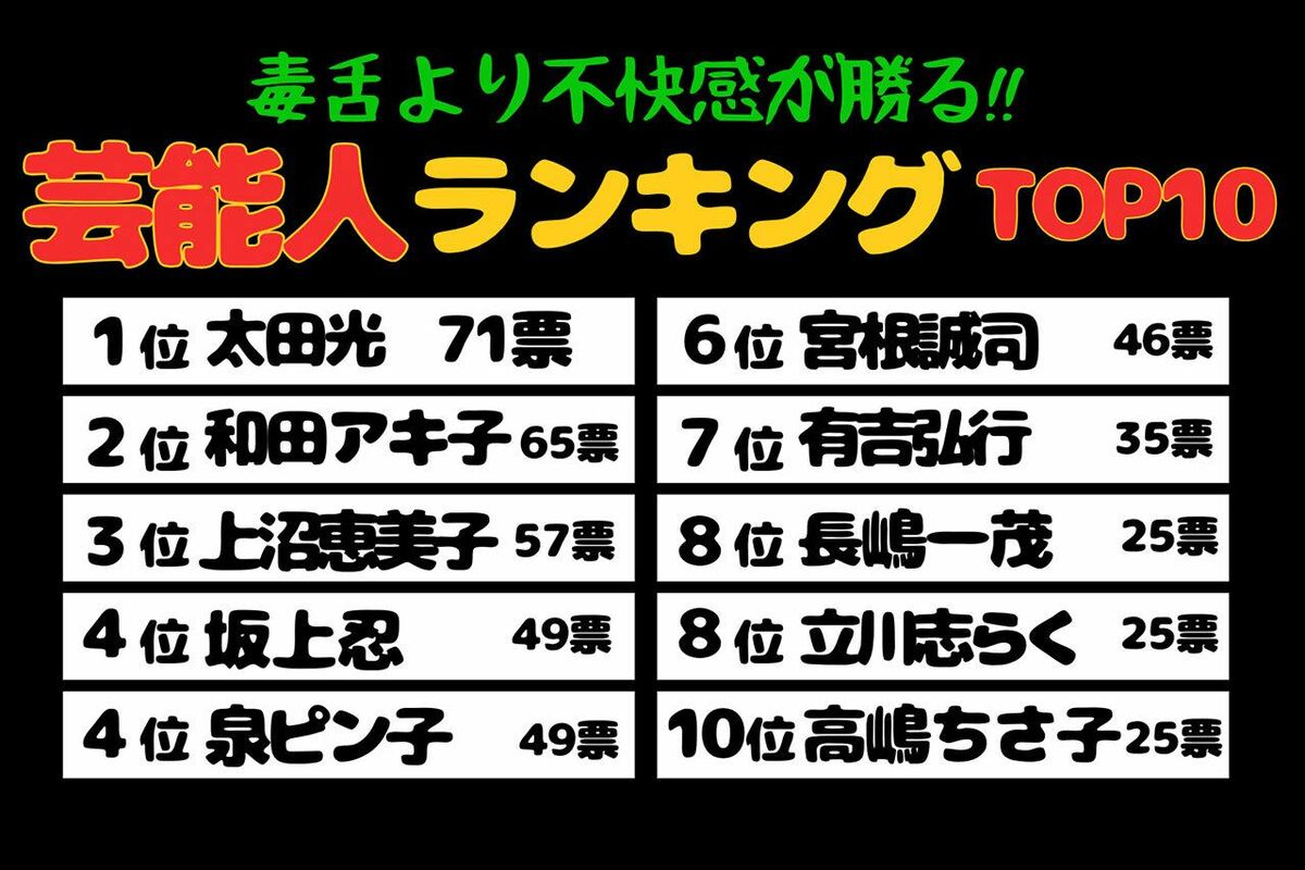 芸能 2026/4/27 《「毒舌というより不快感が勝る」大御所芸能人ランキング》上沼恵美子、和田アキ子ら“ご意見番”を抑えたワースト1位は『爆笑問題』太田光 上沼恵美子坂上忍ビートたけし太田光高嶋ちさ子宮根誠司梅沢富美男長嶋一茂泉ピン子和田アキ子有吉弘行立川志らくランキングお笑い芸人テレビ番組タレント 印刷 [写真 1/32枚目] 「毒舌というより不快感が勝る大御所芸能人」ランキングTOP10 [写真 2/32枚目] 高嶋ちさ子 [写真 3/32枚目] 立川志らく [写真 4/32枚目] 長嶋一茂 [写真 5/32枚目] 有吉弘行 [写真 6/32枚目] 宮根誠司 [写真 7/32枚目] 泉ピン子 [写真 8/32枚目] 『坂上どうぶつ王国』MCの坂上忍。2匹の犬の映像を笑いながら見ていたが、“飼い主”としての自覚に疑問符が…… [写真 9/32枚目] 上沼恵美子(本人のYouTubeチャンネルより) [写真 10/32枚目] 和田アキ子 [写真 11/32枚目] 爆笑問題の太田光 [写真 12/32枚目] 「毒舌というより不快感が勝る大御所芸能人」ランキングTOP10 [写真 13/32枚目] 2023年10月、新CM発表会で杖をついて登場した和田アキ子 [写真 14/32枚目] 和田アキ子 [写真 15/32枚目] 胸元を大胆露出した衣装で熱唱する和田アキ子 [写真 16/32枚目] 2024年の『ベストヒット歌謡祭』で司会を務めたウエンツ瑛士(左)と宮根誠司(公式Xより) [写真 17/32枚目] 宮根誠司(2019年) [写真 18/32枚目] SNSで拡散されている、『ミヤネ屋』取材で韓国を訪れた宮根誠司の路上喫煙 [写真 19/32枚目] SNSで拡散されている、『ミヤネ屋』取材で韓国を訪れた宮根誠司の路上喫煙 [写真 20/32枚目] SNSで拡散されている、『ミヤネ屋』取材で韓国を訪れた宮根誠司の路上喫煙 [写真 21/32枚目] 「毒舌より不快感が勝る大御所芸能人」ランキングTOP10 [写真 22/32枚目] 太田光の姿勢にも疑問が集まった(『TBS NEWS DIG』公式Xより) [写真 23/32枚目] 不機嫌そうに太田光を見つめる石破首相(『TBS NEWS DIG』公式Xより) [写真 24/32枚目] 石破首相に批判が殺到(『TBS NEWS DIG』公式Xより) [写真 25/32枚目] 泉ピン子 [写真 26/32枚目] 泉ピン子('19年) [写真 27/32枚目] 梅沢富美男 [写真 28/32枚目] 71歳でもまだまだ現役、梅沢富美男の女形が美しい(公式インスタグラムより) [写真 29/32枚目] 梅沢富美男 [写真 30/32枚目] 1992年6月、映画『課長 島耕作』の制作発表に出席した坂上忍 [写真 31/32枚目] 坂上忍 [写真 32/32枚目] 坂上忍 この写真の記事へ戻る