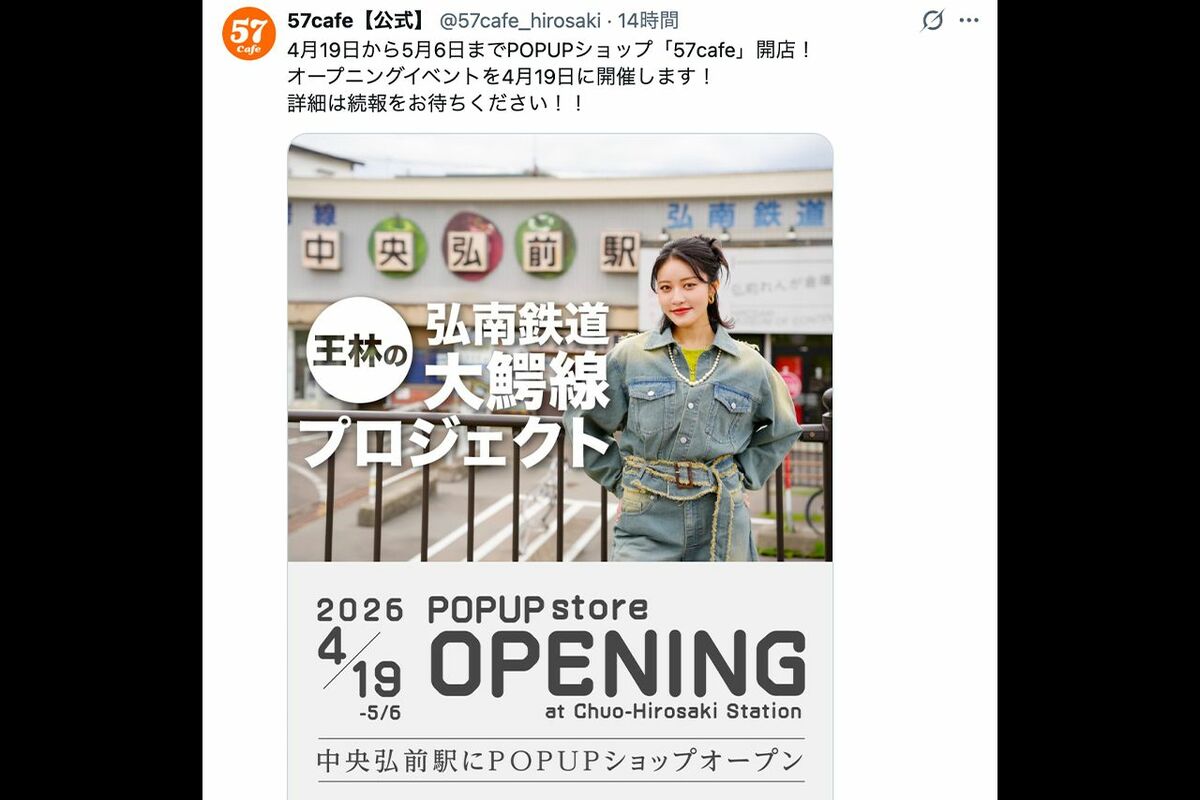 芸能 2026/4/10 王林、古巣復帰で加速する“青森県知事への道” 思い出の弘南鉄道を救う「まちおこし」に自ら名乗り 王林タレント 印刷 [写真 1/14枚目] 弘南鉄道・大鰐線のまちおこしプロジェクトに参加する王林 [写真 2/14枚目] 弘南鉄道・大鰐線の中央弘前駅 撮影/編集部 [写真 3/14枚目] 弘南鉄道・大鰐線のプロジェクトに参加した王林(弘南鉄道公式サイトより) [写真 4/14枚目] グラビアアイドル顔負けのセクシーショットを投稿した王林(本人のインスタグラムより) [写真 5/14枚目] グラビアアイドル顔負けのセクシーショットを投稿した王林(本人のインスタグラムより) [写真 6/14枚目] 青森りんごCMキャラクター「りんごウーマン」に扮した王林の看板 撮影/編集部 [写真 7/14枚目] 王林プロデュースのPOPUPショップ「57cafe」がオープンする場所(公式Xより) [写真 8/14枚目] 王林プロデュースのPOPUPショップ「57cafe」(公式Xより) [写真 9/14枚目] 4月19日から5月6日まで営業する王林プロデュースのPOPUPショップ「57cafe」公式Xアカウント [写真 10/14枚目] 弘南鉄道・大鰐線の中央弘前駅 撮影/編集部 [写真 11/14枚目] 弘前市内を走る王林がイメージキャラクターに起用された青森県警察のラッピングバス 撮影/編集部 [写真 12/14枚目] 弘前れんが倉庫美術館 撮影/編集部 [写真 13/14枚目] 弘前城 撮影/編集部 [写真 14/14枚目] 弘前れんが倉庫美術館 撮影/編集部 この写真の記事へ戻る
