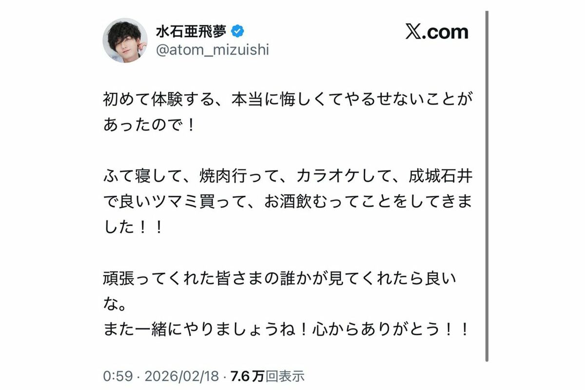 芸能 2026/4/14 テレビ東京〈縦型ショートドラマ〉制作途中に監督のパワハラでお蔵入り「本当に悔しい」主演の水石亜飛夢は“匂わせ”投稿 パワハラテレビ番組YouTube男優動画Xゆうたろう 印刷 [写真 1/9枚目] テレビ東京 写真/共同通信社 [写真 2/9枚目] 《悔しくてやるせないことがあった》と、“何か”があったことをにおわせる水石亜飛夢のX投稿 [写真 3/9枚目] 2020年、テレビ朝日『魔進戦隊キラメイジャー』に出演した水石亜飛夢 [写真 4/9枚目] ゆうたろう [写真 5/9枚目] “パパ活”と添えて投稿されたゆうたろうとのツーショット(三木康一郎監督のXより) [写真 6/9枚目] ゆうたろう 撮影/吉岡竜紀 [写真 7/9枚目] 2024年11月放送の『テレ東音楽祭』に出演した後藤真希とAKB(後藤真希のインスタグラムより) [写真 8/9枚目] 2024年11月放送の『テレ東音楽祭』に出演した後藤真希(本人のインスタグラムより) [写真 9/9枚目] 2024年11月放送の『テレ東音楽祭』に出演したMAX(番組の公式Xより) この写真の記事へ戻る