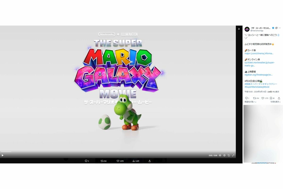 トレンド 2026/4/17 映画『ザ・スーパーマリオギャラクシー・ムービー』が全世界で1000億円を突破、良心価格のグッズ展開に「全部ほしい」の声 映画アニメ流行ゲーム海外 印刷 [写真 1/17枚目] 映画『ザ・スーパーマリオギャラクシー・ムービー』(公式サイトより) [写真 2/17枚目] 映画『ザ・スーパーマリオギャラクシー・ムービー』のグッズ [写真 3/17枚目] 『Nintendo Switch 2』の「マリオカートワールド」CMに出演するSnow Man(公式HPより) [写真 4/17枚目] Snow Manの4人が「Switch2」で『マリオカート ワールド』をプレイ(公式サイトより) [写真 5/17枚目] 『マリオカート』で大はしゃぎの深澤辰哉とラウール(任天堂公式YouTubeより) [写真 6/17枚目] USJでもスーパーマリオに扮装していたゆうちゃみ(公式インスタグラム) [写真 7/17枚目] スーパーマリオは大ヒット(公式HPより) [写真 8/17枚目] 自宅で気軽にゴルフ気分を味わえる『マリオゴルフスーパーラッシュ』 (C)Nintendo/CAMELOT [写真 9/17枚目] 4月24日から日本での公開が始まる映画『ザ・スーパーマリオギャラクシー・ムービー』(公式Xより) [写真 10/17枚目] 4月24日から日本での公開が始まる映画『ザ・スーパーマリオギャラクシー・ムービー』(公式Xより) [写真 11/17枚目] 4月24日から日本での公開が始まる映画『ザ・スーパーマリオギャラクシー・ムービー』(公式Xより) [写真 12/17枚目] 4月24日から日本での公開が始まる映画『ザ・スーパーマリオギャラクシー・ムービー』(公式Xより) [写真 13/17枚目] 4月24日から日本での公開が始まる映画『ザ・スーパーマリオギャラクシー・ムービー』(公式Xより) [写真 14/17枚目] 4月24日から日本での公開が始まる映画『ザ・スーパーマリオギャラクシー・ムービー』(公式Xより) [写真 15/17枚目] 4月24日から日本での公開が始まる映画『ザ・スーパーマリオギャラクシー・ムービー』(公式Xより) [写真 16/17枚目] 今作から大人気キャラのヨッシーが登場(公式Xより) [写真 17/17枚目] 映画『ザ・スーパーマリオギャラクシー・ムービー』(公式サイトより) この写真の記事へ戻る