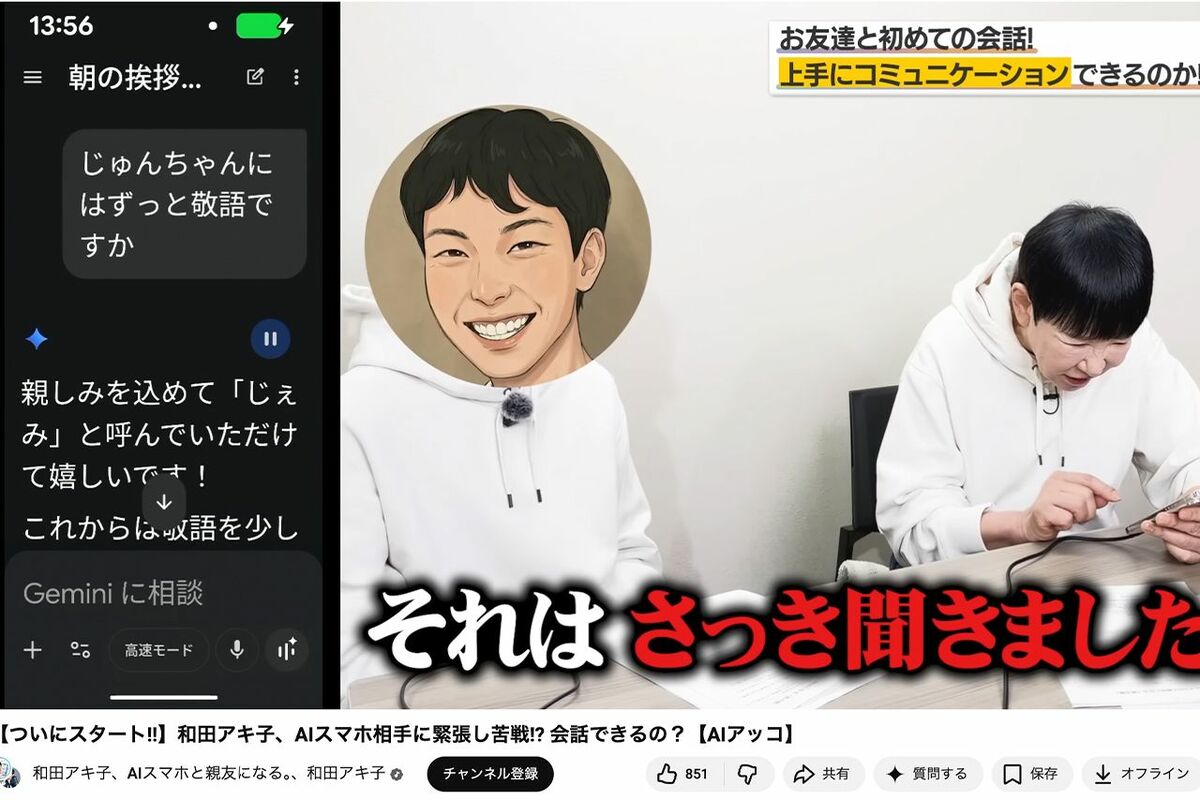 芸能 2026/4/16 和田アキ子YouTube、登録者4000人以下の「苦戦」もスタッフへの低姿勢と“AIへの挑戦”で見せた意外な変化 和田アキ子アーティストタレントYouTubeTBS 印刷 [写真 1/11枚目] 和田アキ子 [写真 2/11枚目] 入社1年目のスタッフにも低姿勢の和田アキ子(YouTube『和田アキ子、AIスマホと親友になる。』より) [写真 3/11枚目] 再生回数が伸び悩んでいるYouTube番組『和田アキ子、AIスマホと親友になる。』 [写真 4/11枚目] TOKYOMXが手掛けているYouTube『和田アキ子、AIスマホと親友になる。』 [写真 5/11枚目] YouTube『和田アキ子、AIスマホと親友になる。』をスタートさせた和田アキ子 [写真 6/11枚目] TOKYOMXが手掛けているYouTube『和田アキ子、AIスマホと親友になる。』 [写真 7/11枚目] 和田アキ子とお笑いコンビ・レインボーのジャンボたかおが出演する番組『アッコとジャンボ』(TBSの公式サイトより) [写真 8/11枚目] 2023年10月、新CM発表会で杖をついて登場した和田アキ子 [写真 9/11枚目] '18年4月の園遊会で、タレントの和田アキ子と懇談された紀子さま。今回も招待者との交流に注目が集まる [写真 10/11枚目] 上沼恵美子と和田アキ子('95年『紅白歌合戦』リハーサル) [写真 11/11枚目] 昭和45年当時、和田アキ子とのツーショット この写真の記事へ戻る