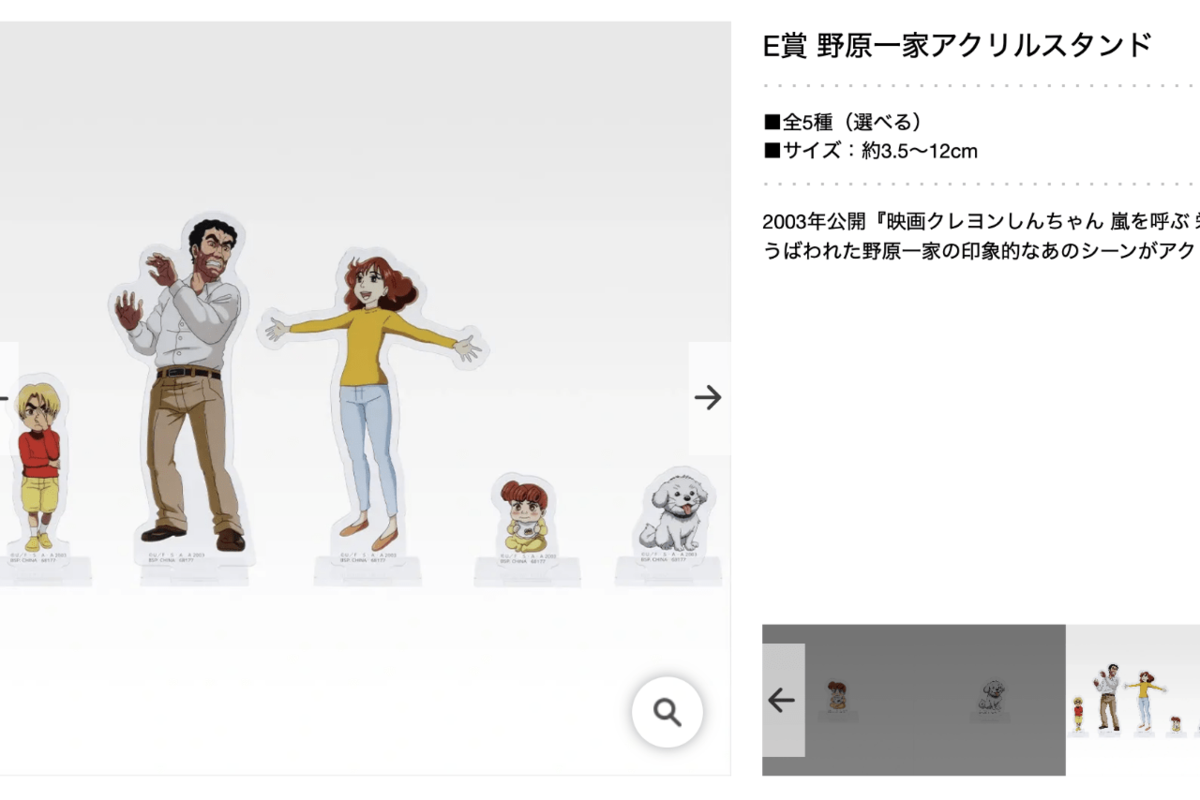 芸能 2026/4/17 《劇場版クレヨンしんちゃん》一番くじvol.2全ラインナップ発表で「これは泣く」期待高まるも懸念される“アクセス集中”と“転売” アニメテレビ番組流行SNS 印刷 [写真 1/12枚目] 『一番くじ劇場版クレヨンしんちゃんvol.2名作シネマズ』(公式サイトより) [写真 2/12枚目] A賞ロボとーちゃん名シーンビネットフィギュア『一番くじ劇場版クレヨンしんちゃんvol.2名作シネマズ』(公式サイトより) [写真 3/12枚目] 『やかんの麦茶 from爽健美茶』新CMでの人気アニメ『クレヨンしんちゃん』実写化シリーズでは、追加キャラクターが示唆されている(公式インスタグラムより) [写真 4/12枚目] 人気アニメ『クレヨンしんちゃん』のラベル仕様となっている『やかんの麦茶 from爽健美茶』(公式サイトより) [写真 5/12枚目] 人気アニメ『クレヨンしんちゃん』実写化シリーズを公開している『やかんの麦茶 from爽健美茶』(公式サイトより) [写真 6/12枚目] 『やかんの麦茶 from爽健美茶』新CMでは人気アニメ『クレヨンしんちゃん』実写化シリーズが第2シーズンに突入(公式インスタグラムより) [写真 7/12枚目] 『やかんの麦茶 from爽健美茶』新CMでは人気アニメ『クレヨンしんちゃん』実写化シリーズが第2シーズンに突入(公式インスタグラムより) [写真 8/12枚目] B賞 珠由良ブラザーズ MASTERLISE『一番くじ 劇場版クレヨンしんちゃん vol.2 名作シネマズ』(公式サイトより) [写真 9/12枚目] C賞 ビッグタオル『一番くじ 劇場版クレヨンしんちゃん vol.2 名作シネマズ』(公式サイトより) [写真 10/12枚目] D賞 マカオとジョマ ガラスプレート『一番くじ 劇場版クレヨンしんちゃん vol.2 名作シネマズ』(公式サイトより) [写真 11/12枚目] E賞 野原一家アクリルスタンド『一番くじ 劇場版クレヨンしんちゃん vol.2 名作シネマズ』(公式サイトより) [写真 12/12枚目] F賞 しんちゃんラバースタンド『一番くじ 劇場版クレヨンしんちゃん vol.2 名作シネマズ』(公式サイトより) この写真の記事へ戻る