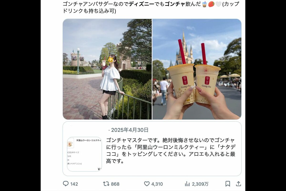ライフ 2026/4/20 ディズニーランドへの「ゴンチャ持ち込み投稿」が“マナー違反では?”と波紋…規約の“死角”に広報部の回答は ビジネス 印刷 [写真 1/11枚目] 写真左:ゴンチャの黒糖烏龍ミルクティー (撮影/編集部)、写真右:東京ディズニーランド(公式サイトより) [写真 2/11枚目] 批判が殺到したTDL内にゴンチャを飲む女性ユーザー(Xより) [写真 3/11枚目] TDLでゴンチャの持ち込みが可能か確認したという女性ユーザー(Xより) [写真 4/11枚目] 園内持ち込みに関する注意欄(東京ディズニーリゾート公式サイトより) [写真 5/11枚目] ディズニーで胸元を露出する女性(本人Xより) [写真 6/11枚目] アンバサダーというのはゴンチャの会員のランクの1つ(ゴンチャ公式サイトより) [写真 7/11枚目] ゴンチャ(Gongcha) *写真はイメージです 撮影/編集部 [写真 8/11枚目] 物議を醸したインフルエンサー・さくらのTikTok動画(モザイクは編集部が処理) [写真 9/11枚目] 新しい『スペース・マウンテン』のイメージ(公式インスタグラムより) [写真 10/11枚目] 公開された空撮写真(公式インスタグラムより) [写真 11/11枚目] 公開された空撮写真(公式インスタグラムより) この写真の記事へ戻る