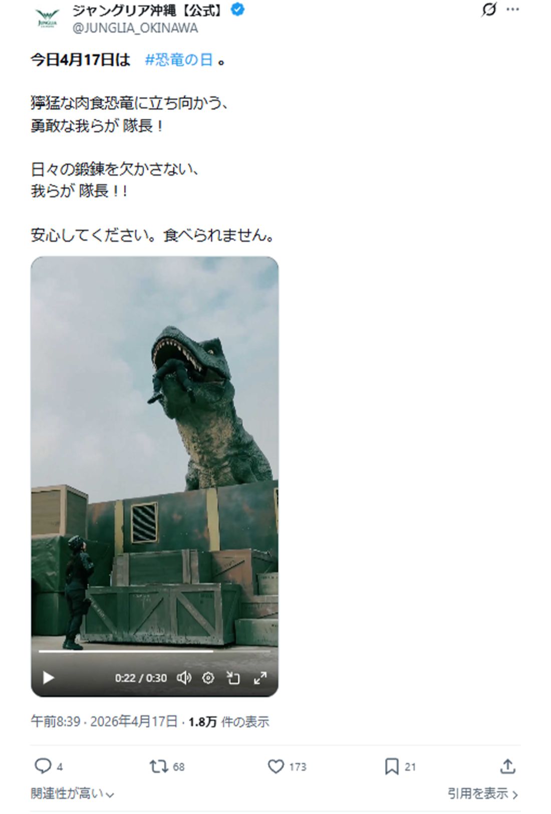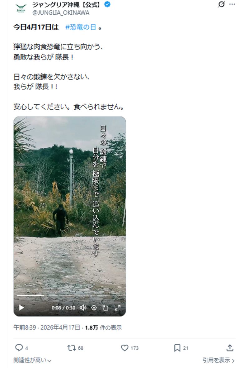 トレンド 2026/4/18 《ジャングリア沖縄》「絶対に食べられません」→直後に食われる『ダイナソーサファリ』“隊長”の衝撃動画に総ツッコミ ジャングリア沖縄沖縄遊園地流行X 印刷 [写真 1/34枚目] 人気アトラクション『ダイナソーサファリ』(『ジャングリア』公式サイトより) [写真 2/34枚目] 1月24日から始まるジャングリア沖縄の新アトラクション『グラビティ ドロップ』(公式サイトより) [写真 3/34枚目] 2025年の大晦日に『ジャングリア沖縄』を訪れた人は、混雑した様子を報告している(Xより) [写真 4/34枚目] ジャングリアの新アトラクション『やんばるトルネード』(公式サイト) [写真 5/34枚目] 開業から約4か月後のジャングリア沖縄(旅系YouTuber『転生のぶりん』チャンネルより) [写真 6/34枚目] 開業から約4か月後のジャングリア沖縄(旅系YouTuber『転生のぶりん』チャンネルより) [写真 7/34枚目] 開業から約4か月後のジャングリア沖縄(旅系YouTuber『転生のぶりん』チャンネルより) [写真 8/34枚目] 開業から約4か月後のジャングリア沖縄(旅系YouTuber『転生のぶりん』チャンネルより) [写真 9/34枚目] 開業から約4か月後のジャングリア沖縄(旅系YouTuber『転生のぶりん』チャンネルより) [写真 10/34枚目] 開業から約4か月後のジャングリア沖縄(旅系YouTuber『転生のぶりん』チャンネルより) [写真 11/34枚目] 『ジャングリア沖縄』の実際の様子(Xより) [写真 12/34枚目] 『ジャングリア沖縄』のイメージ画像(公式サイトより) [写真 13/34枚目] 『ジャングリア沖縄』の実際の様子(Xより) [写真 14/34枚目] 『ジャングリア沖縄』の実際の様子(Xより) [写真 15/34枚目] 『ジャングリア沖縄』のイメージ画像(公式インスタグラムより) [写真 16/34枚目] 『ジャングリア沖縄』のアトラクション(公式サイトより) [写真 17/34枚目] 『ジャングリア沖縄』のアトラクション(公式サイトより) [写真 18/34枚目] 『ジャングリア沖縄』のアトラクション(公式サイトより) [写真 19/34枚目] 『ジャングリア沖縄』のアトラクション(公式サイトより) [写真 20/34枚目] 『ジャングリア沖縄』のアトラクション(公式サイトより) [写真 21/34枚目] 『ジャングリア沖縄』のアトラクション(公式サイトより) [写真 22/34枚目] 『ジャングリア沖縄』のアトラクション(公式サイトより) [写真 23/34枚目] 『ジャングリア沖縄』(公式サイトより) [写真 24/34枚目] パノラマ ダイニングのイメージ図(ジャングリア沖縄公式サイトより) [写真 25/34枚目] 食べられてしまった隊長(『ジャングリア沖縄』公式Xより) [写真 26/34枚目] 安全だと言っていた隊長だったが…(『ジャングリア沖縄』公式Xより) [写真 27/34枚目] 腕立て伏せをする隊長(『ジャングリア沖縄』公式Xより) [写真 28/34枚目] ダッシュする隊長(『ジャングリア沖縄』公式Xより) [写真 29/34枚目] 隊長はこれまでに1000回以上も食べられ続けている(『ジャングリア沖縄』公式Xより) [写真 30/34枚目] ジャングリア沖縄(公式Xより) [写真 31/34枚目] 4月29日から運行が始まる『やんばるトルネード』(『ジャングリア』公式Xより) [写真 32/34枚目] 4月29日から運行が始まる『やんばるトルネード』(『ジャングリア』公式Xより) [写真 33/34枚目] 4月29日から運行が始まる『やんばるトルネード』(『ジャングリア』公式Xより) [写真 34/34枚目] プレミアムパスの価格(『ジャングリア』公式サイトより) この写真の記事へ戻る