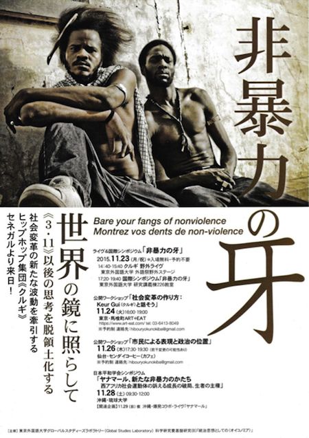 社会・事件 2015/11/28 東京外大で見たセネガルのラッパー「クルギ」はエネルギーの塊だった 神足裕司(コラムニスト) 印刷 [写真 1/2枚目] [写真]クルギは東京外大学祭のほか、東京、仙台、沖縄でもライブ、ワークショップ、シンポジウムを行った。撮影/金子清文 [写真 2/2枚目] この写真の記事へ戻る