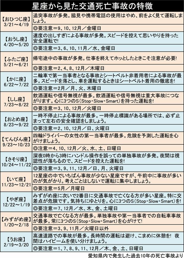 社会・事件 2016/8/28 なぜか交通事故が多い星座は「みずがめ座、やぎ座」逆に事故が少ない星座は? 県民性事故 『週刊女性』編集部 印刷 [写真 1/2枚目] [写真 2/2枚目] この写真の記事へ戻る