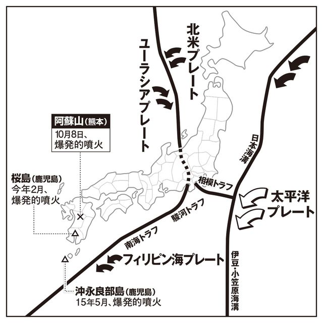 社会・事件 2016/10/20 立命館大・高橋教授が警告「琉球列島―南海トラフ地震は確実に近づいている」 地震噴火 『週刊女性』編集部 印刷 [写真 1/2枚目] 九州の火山の噴火は太平洋プレートが黒幕だった!?(高橋教授の取材などに基づく)作図/スヤマミズホ [写真 2/2枚目] 阿蘇山の中岳第1火口からもうもうと噴き上がる煙=10月8日、共同通信ヘリから空撮 この写真の記事へ戻る