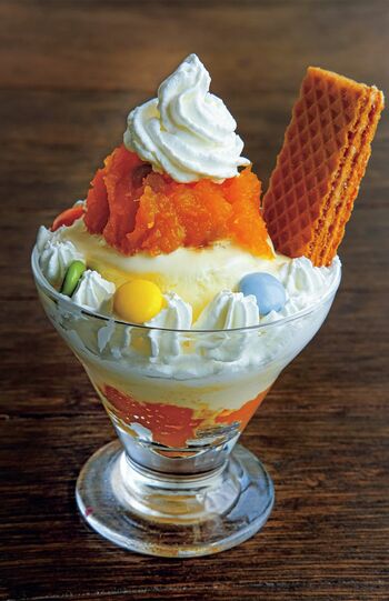 (3)パフェグラスの底に(2)を適量入れて、バニラアイスをのせ、さらに(2)を重ねる。お好みでホイップクリームやマーブルチョコ、ウエハースなどで飾りつける。
