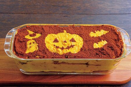 (3)器の底にカステラの半量を並べて、(2)のかぼちゃクリームの半量をのせる。その上から残りのカステラを並べ、残りのクリームをのせる。冷蔵庫で1時間ほど冷やしてからココアパウダーをふる。クッキングシートをおばけやかぼちゃの形にお好みで、切り抜いて型紙として使うと、絵柄が浮かびあがる。