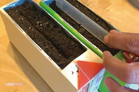 豆乳パック(1l)容器の注ぎ口が下に向くよう立てる。周囲を少し残して上部分(パック側面)を切り取り、八分目まで培養土を入れる。深さ1cmほどのまき溝を作り、1cm間隔で種をまき、1~2cmほど土をかけ、水を与える。