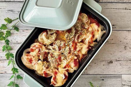 (4)玉ねぎがしんなりしたらトマトケチャップをかけてチーズを散らし、フタをして3分ほど加熱する。チーズが溶けたらお好みでドライパセリを散らす。