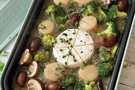 (4)具材に火が通ったら中央にカマンベールチーズを入れてフタをし、1分ほど加熱する。チーズが溶けたらお好みでパセリを散らす(a)。