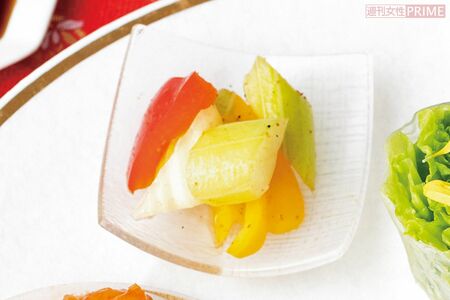 (1)セロリは筋をとり、食べやすい大きさに乱切りにする。赤パプリカ、黄パプリカも同様に乱切りにする。