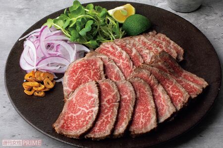 (6)(5)の牛もも肉を薄切りにして、器に盛る。紫玉ねぎ、かいわれ大根、(3)、わさびなどを添える。野菜などと一緒にポン酢でいただく。
