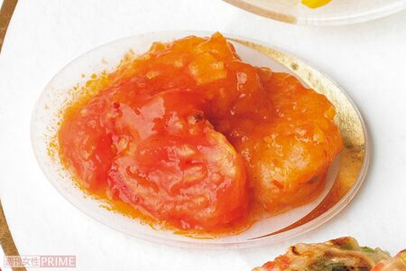 (5)トマト、ねぎ、(3)のエビ、Bを入れて、やさしく混ぜながらとろみがつくまで煮立たせ、器に盛る。