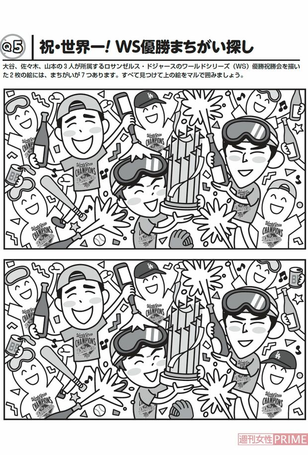 大谷、佐々木、山本の3人が所属するロサンゼルス・ドジャースのワールドシリーズ(WS)優勝祝勝会を描いた2枚の絵には、まちがいが7つあります。すべて見つけて上の絵をマルで囲みましょう。