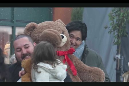 メイキング映像には大きなクマのぬいぐるみを抱いて演技指導を受ける場面などが収められているが、注目は共演の女の子との撮影の合間のやり取り。女の子とぬいぐるみ同士でハイタッチしたり、クマの陰に隠れて“いないいないばあ”をしたりとなんとも微笑ましい姿が映されているのだ。