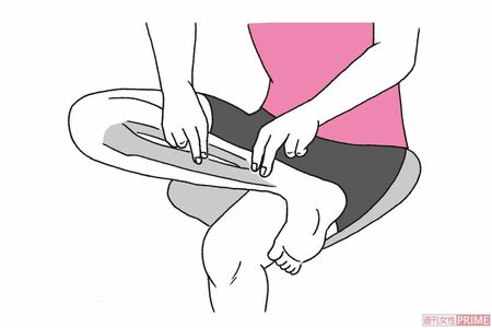 (やり方)内くるぶしにあるすねの骨(脛骨)に沿ってグリグリと押してほぐす。少しずつ位置を変えて30秒から1分ほど、少し痛いと思うくらいでOK。