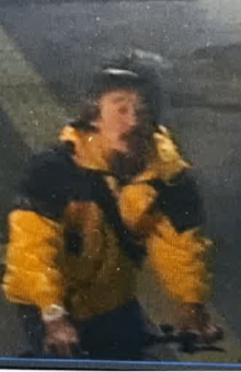 《黄色系のダウンジャケットに色不明の長ズボンを着用、見た目は60歳前後で白髪交じり、自転車を使用》
