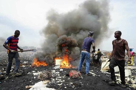 アグボグブロシーのスラムに暮らす16部族3万人の住民は、ゴミの山から廃材を取り出し、バラックの家を建て、電子ゴミを燃やし、残った金属を売って暮らしていた。だが丸一日働いても500円にもならない。