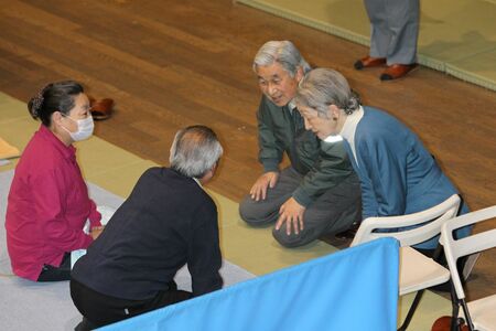 東京武道館で避難生活を送っている被災者を見舞われた両陛下。ひざをつき、同じ目線で励ます姿が印象的だった。