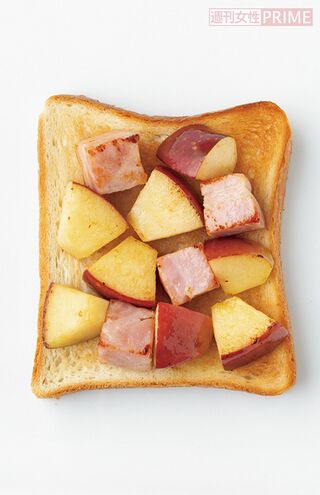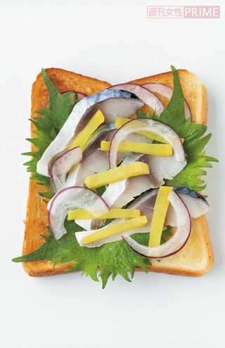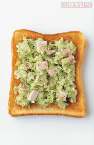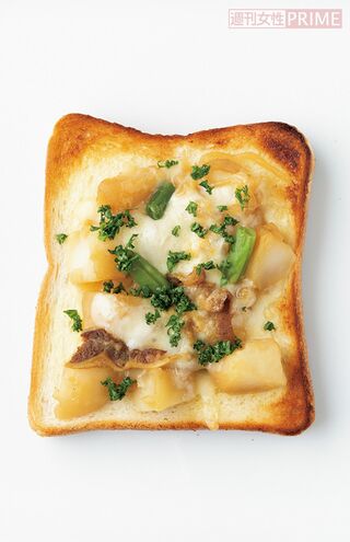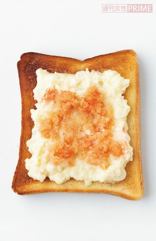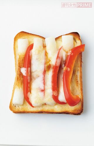 (2)パンにマヨネーズ小さじ1をぬり、(1)を重ね並べてトースターで4分ほど焼く。
